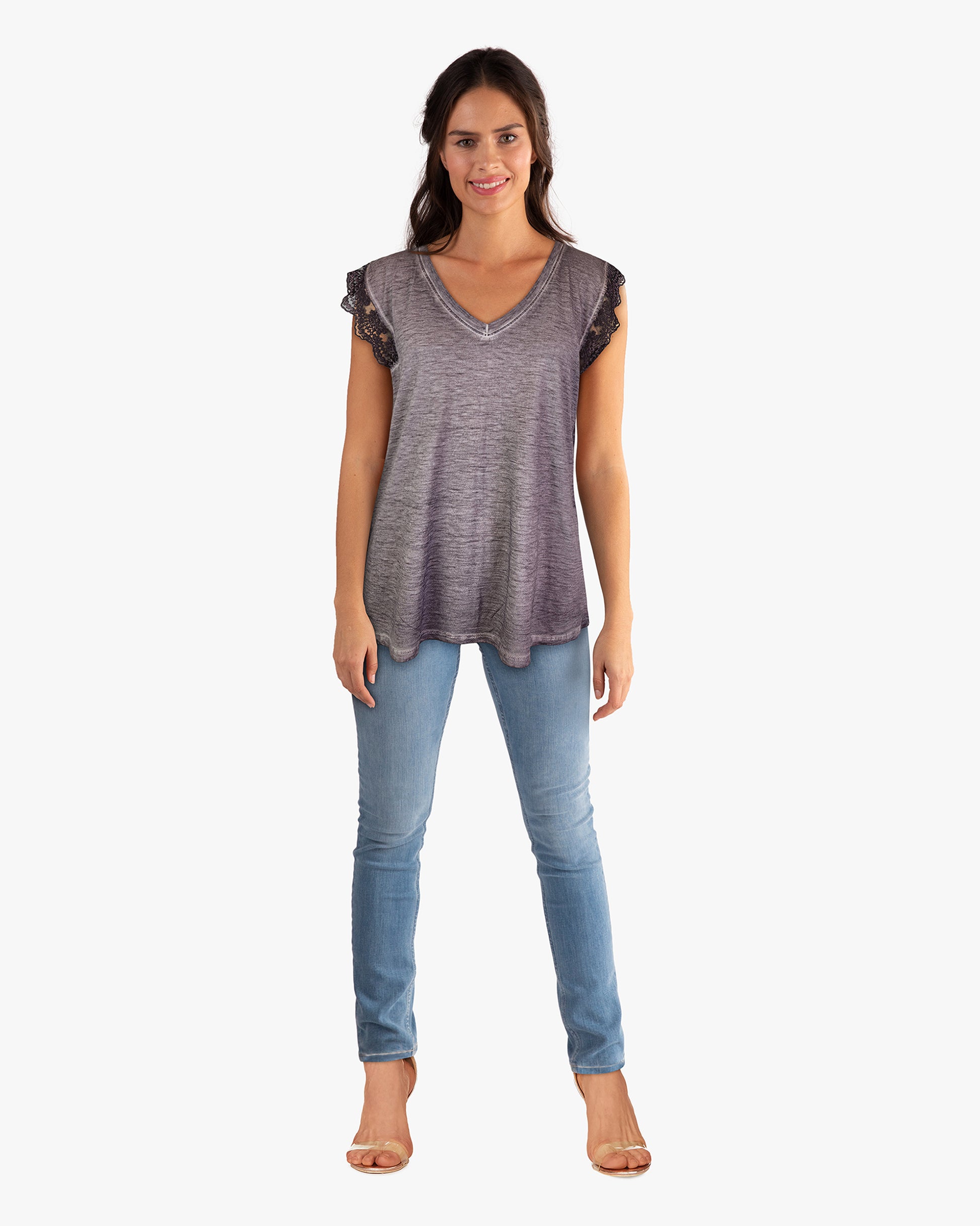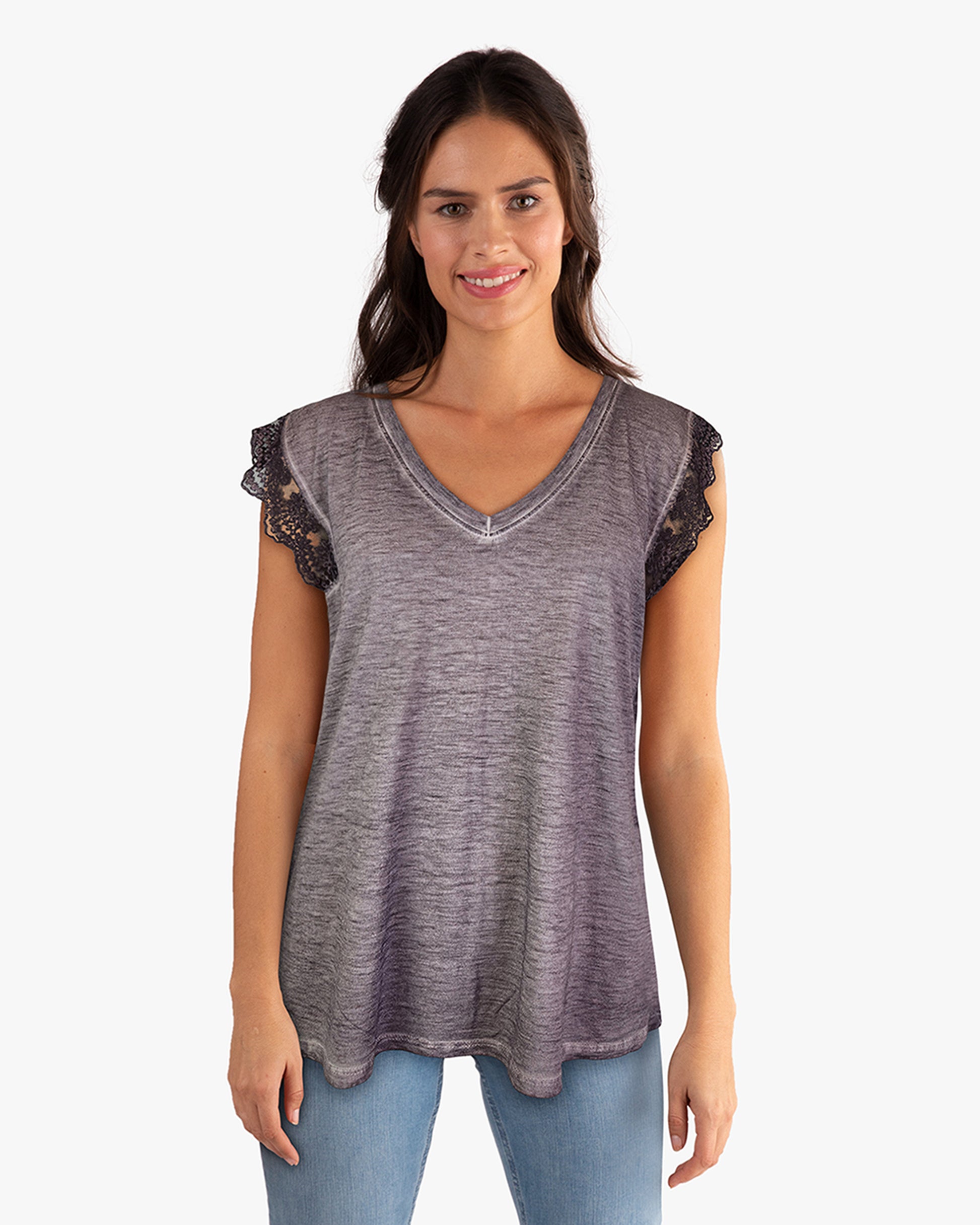 Fit is relaxed. Lace detail extends the shoulder to act as a short sleeve.
