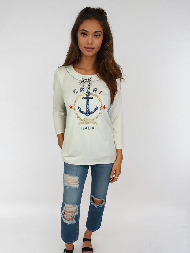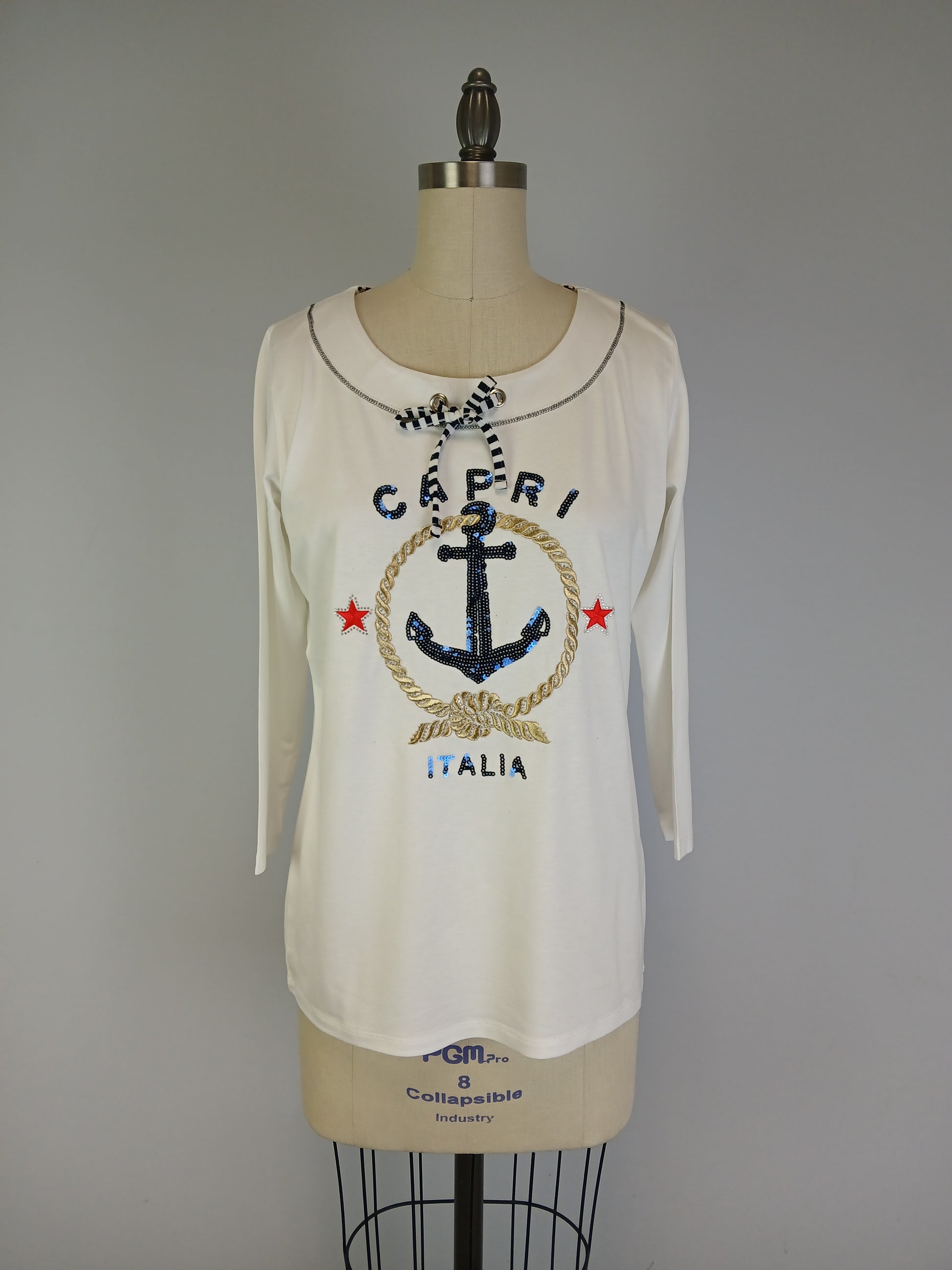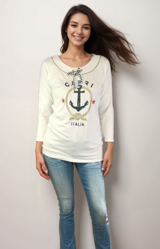 Embroidered detail on the front gives a Nautical vibe to this classic Club Top The Shirt is Hemmed at the sleeve and bottom opening Top is a blend of Rayon and Spandex Imported from Turkey and Designed in Woodinville WA.