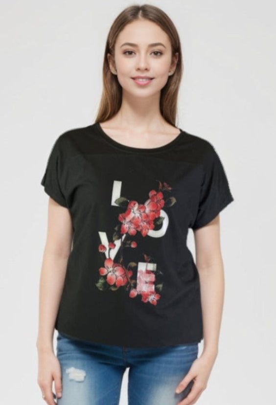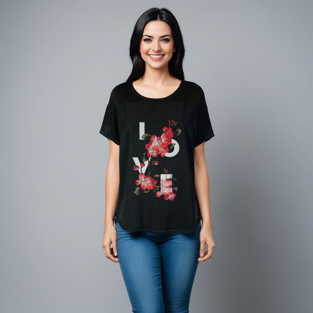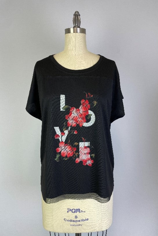 This Top has a mesh overlay with the print LOVE on it The Knit Top has an extended shoulder that acts as a cap sleeve.