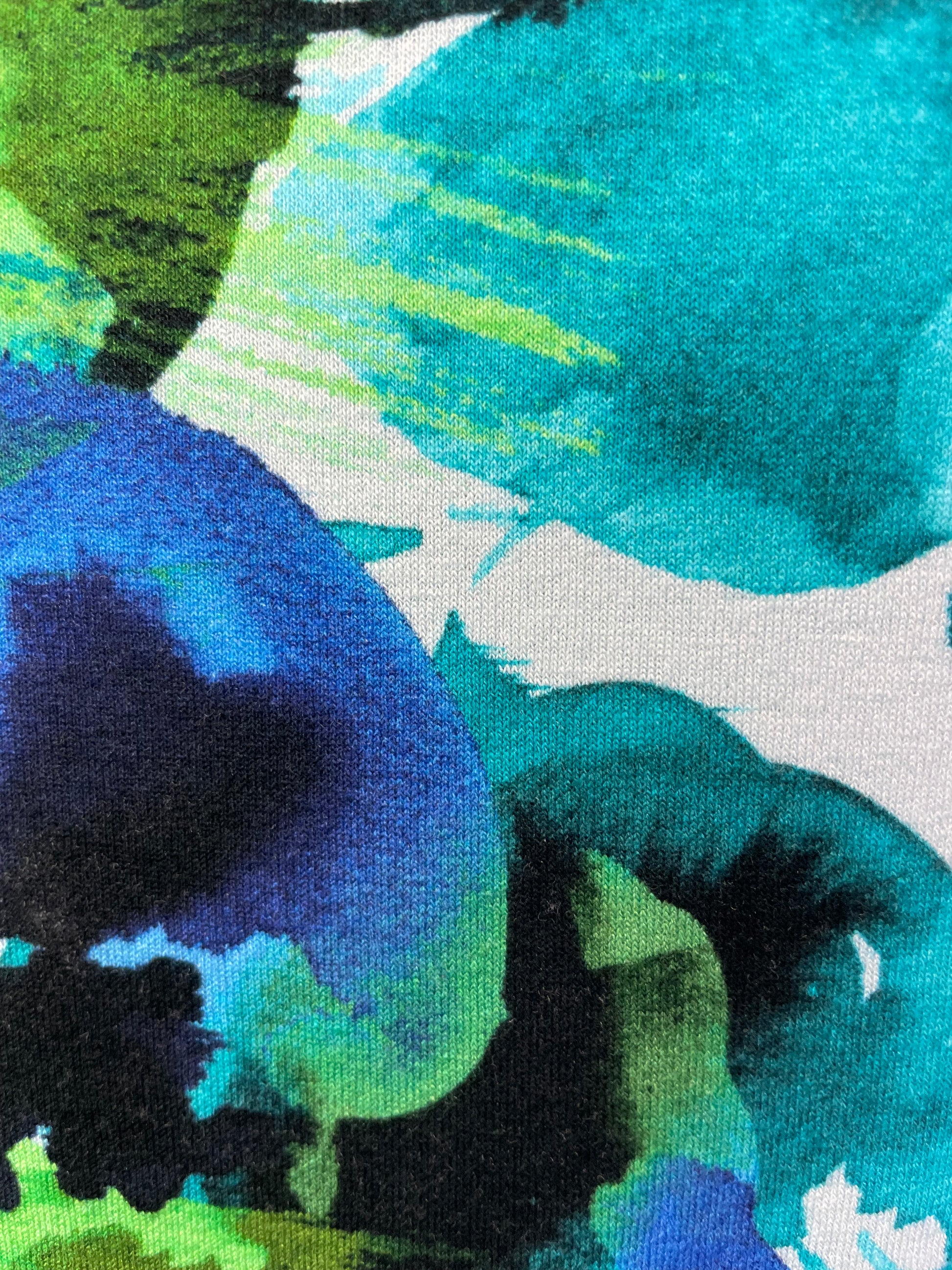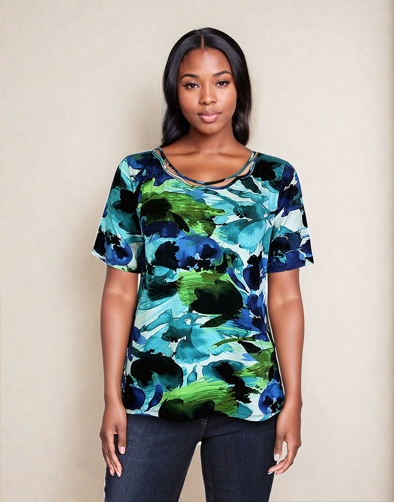 Short Sleeve Knit Printed Top with Neck stitching detail (D27749) Blue and Green Flowers