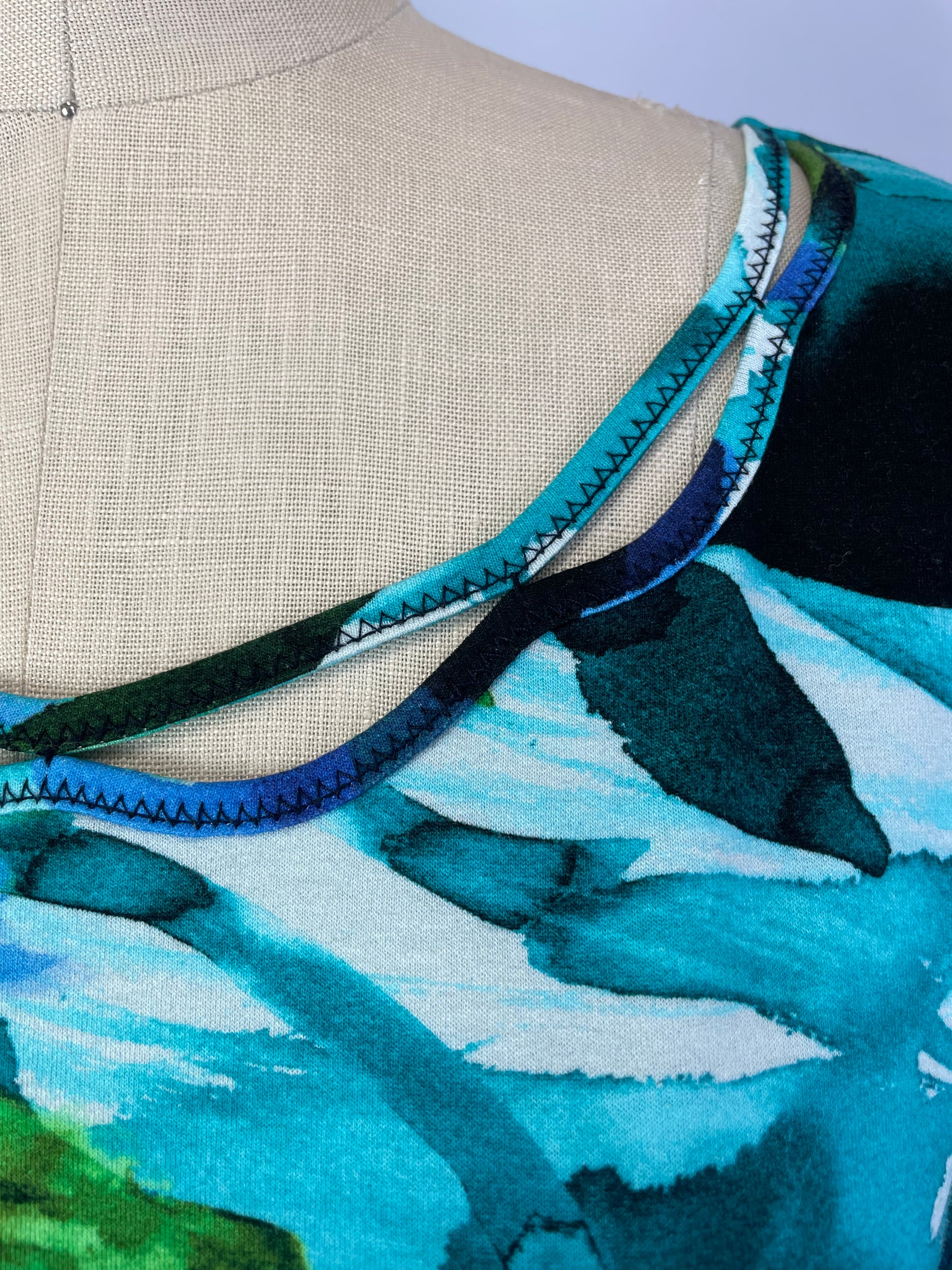 Women's printed knit Top with Cutwork stitching at the neckline. Sleeve is a bit longer, alongside a more relaxed shoulder. Garment is hemmed at the sleeve and bottom opening.