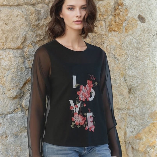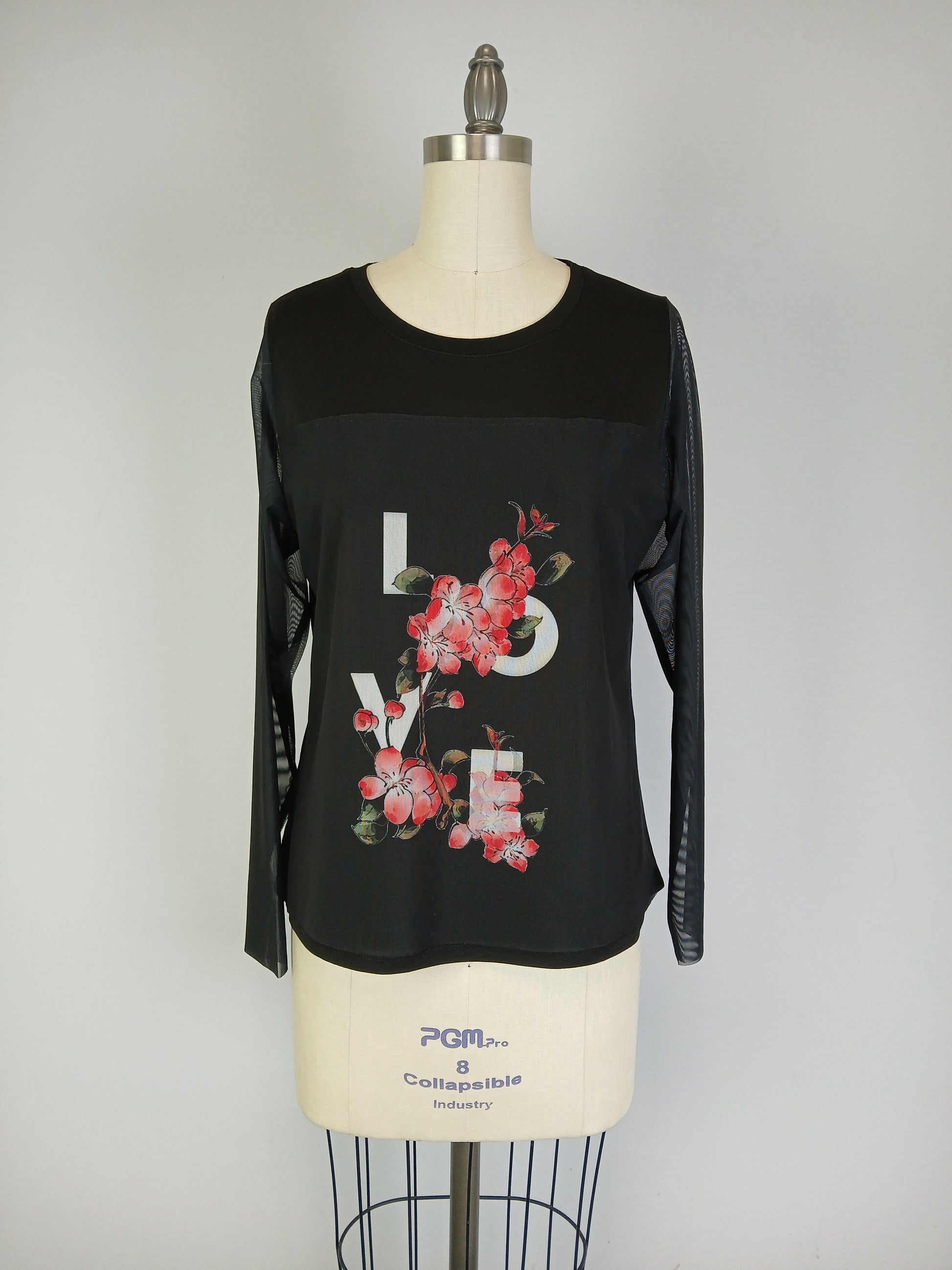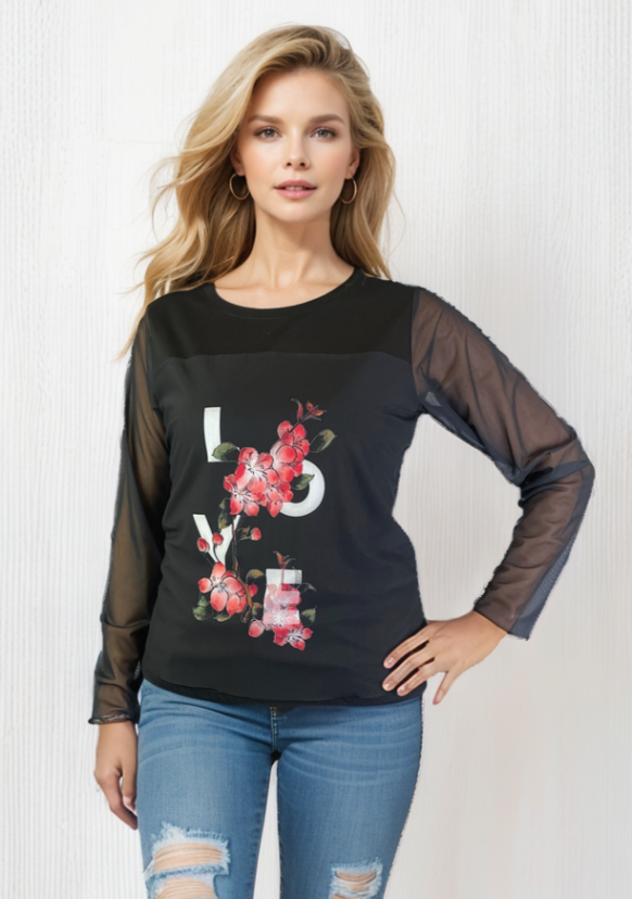 This Garment has the word Love printed on the Mesh Overlay. The Sleeves on this top are mesh.