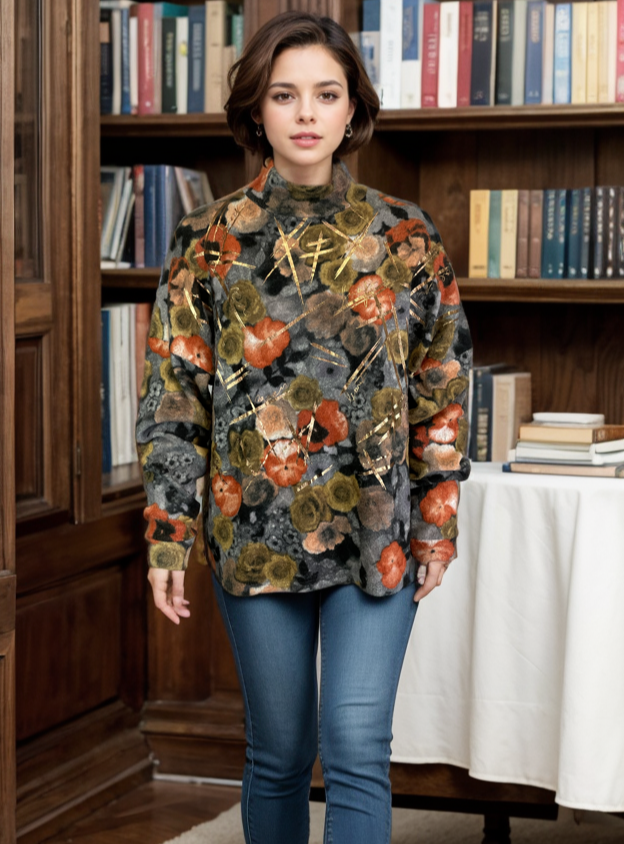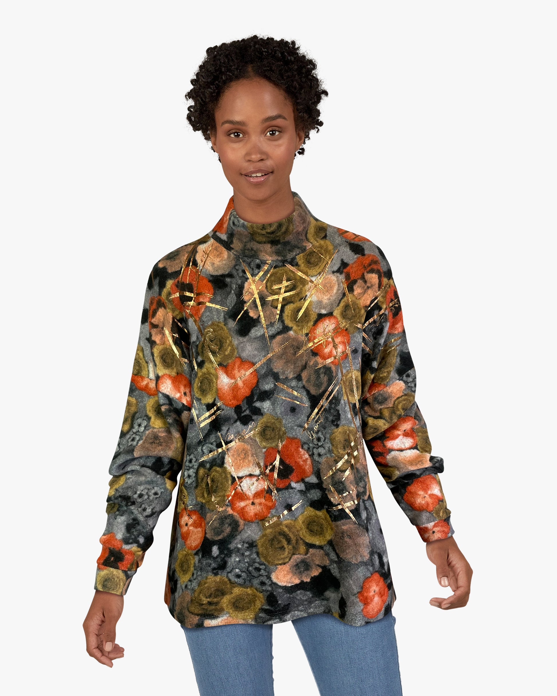 Mock Neck Sweater-like Top - Orange Rose Floral D24671