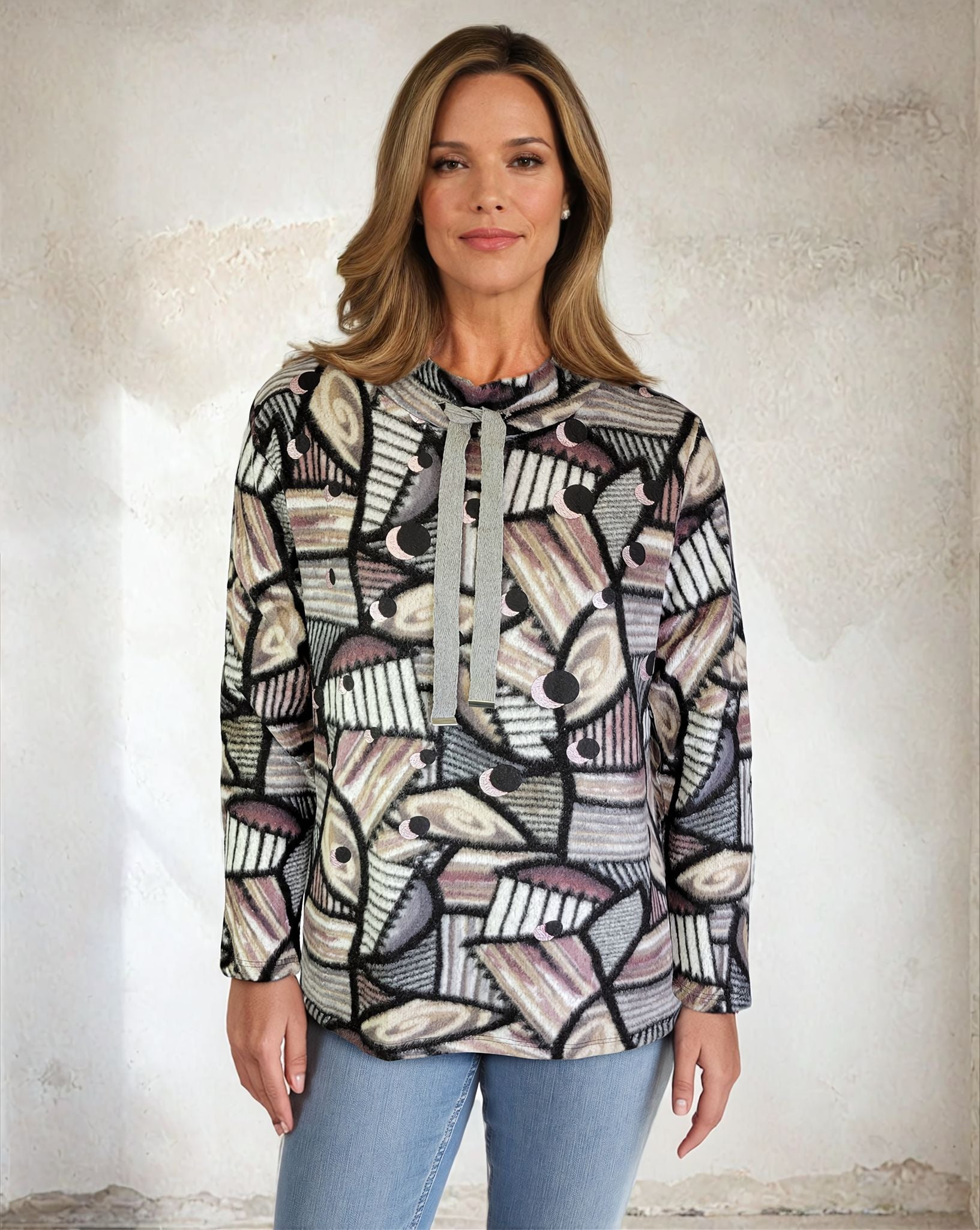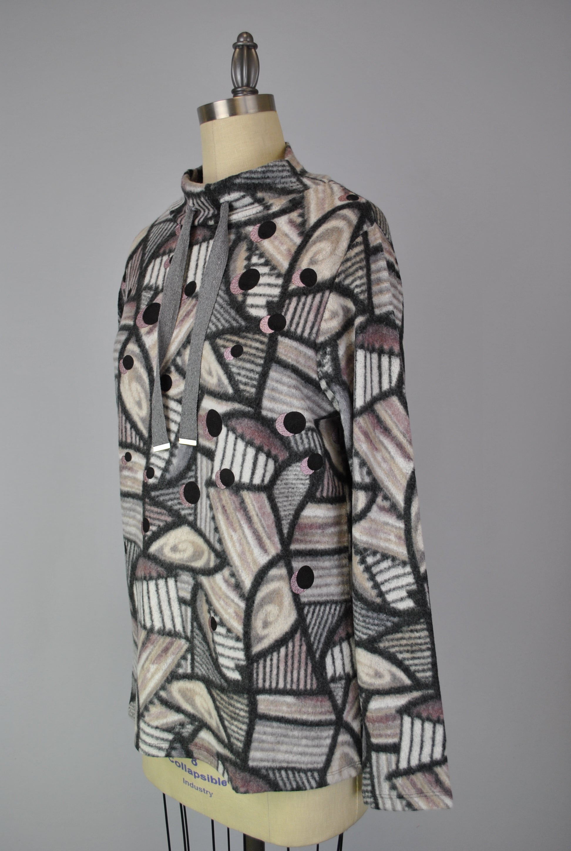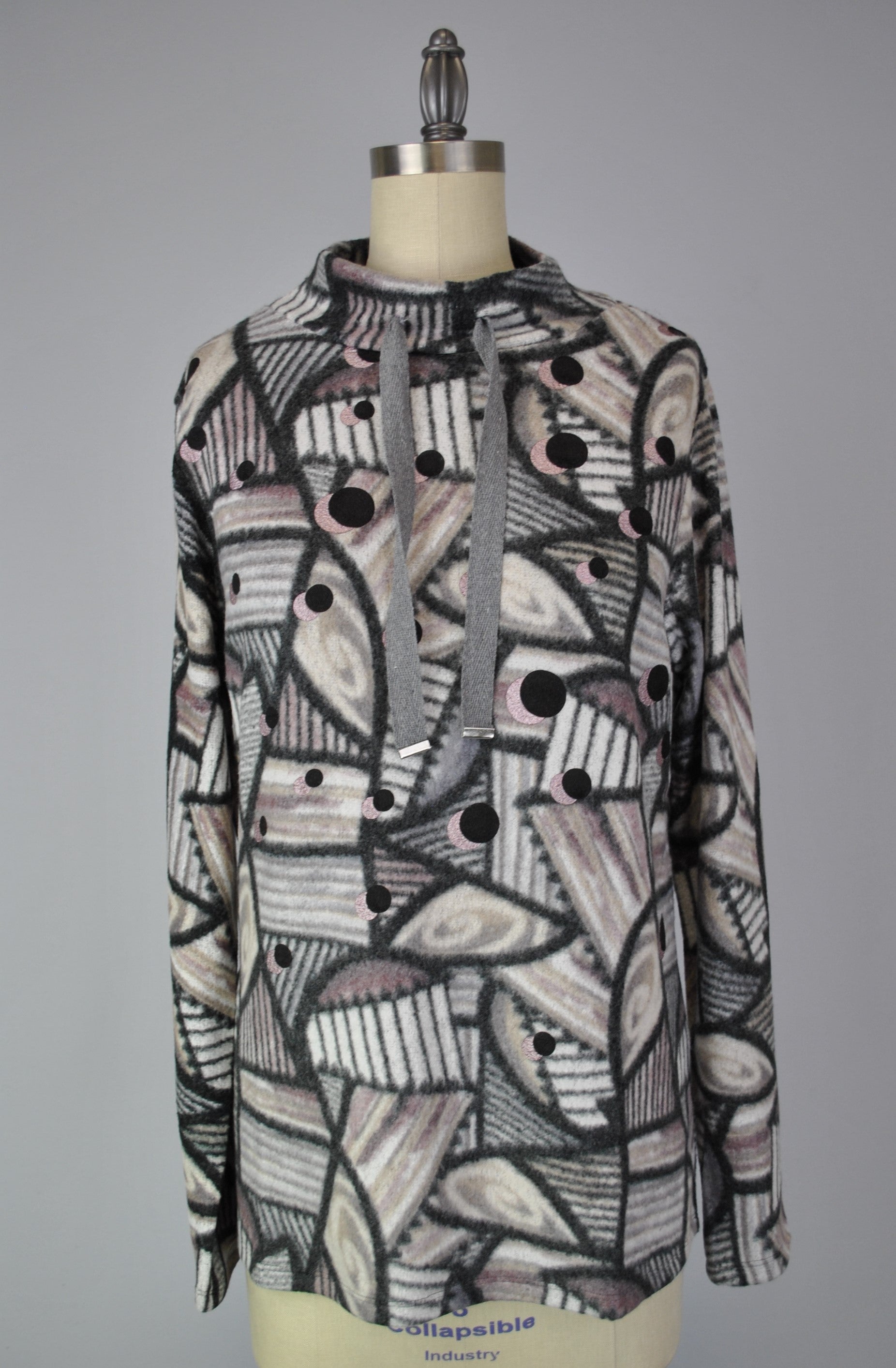 This top is made from a unique fabric we call Yummy, that is brushed for a super soft hand feel. It is a printed garment. Fit is more boxy in shape. It has a mock neck, which is a shorter version of a turtleneck. The neckline features a non-functional tie and it is hemmed at the sleeve opening and bottom opening.