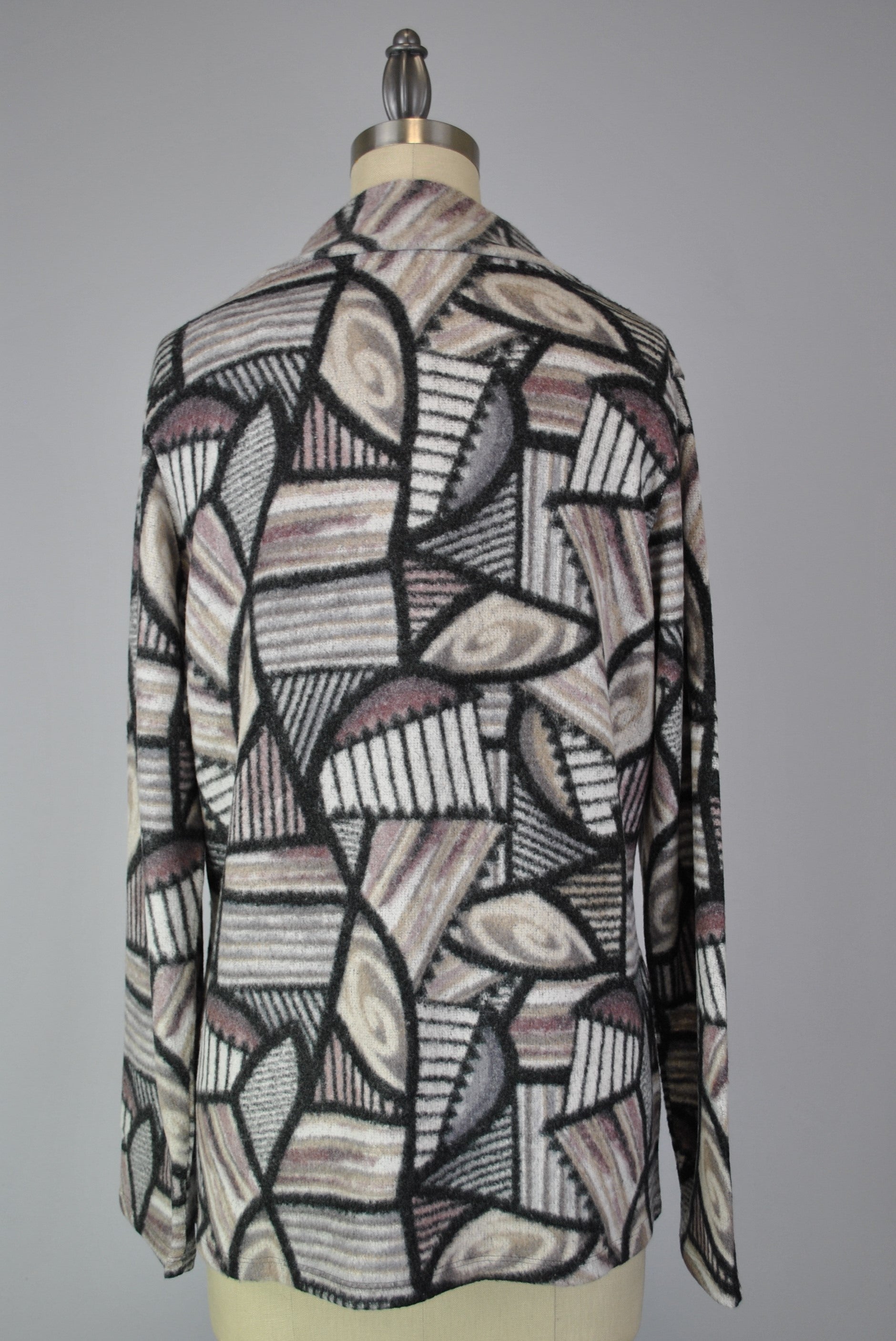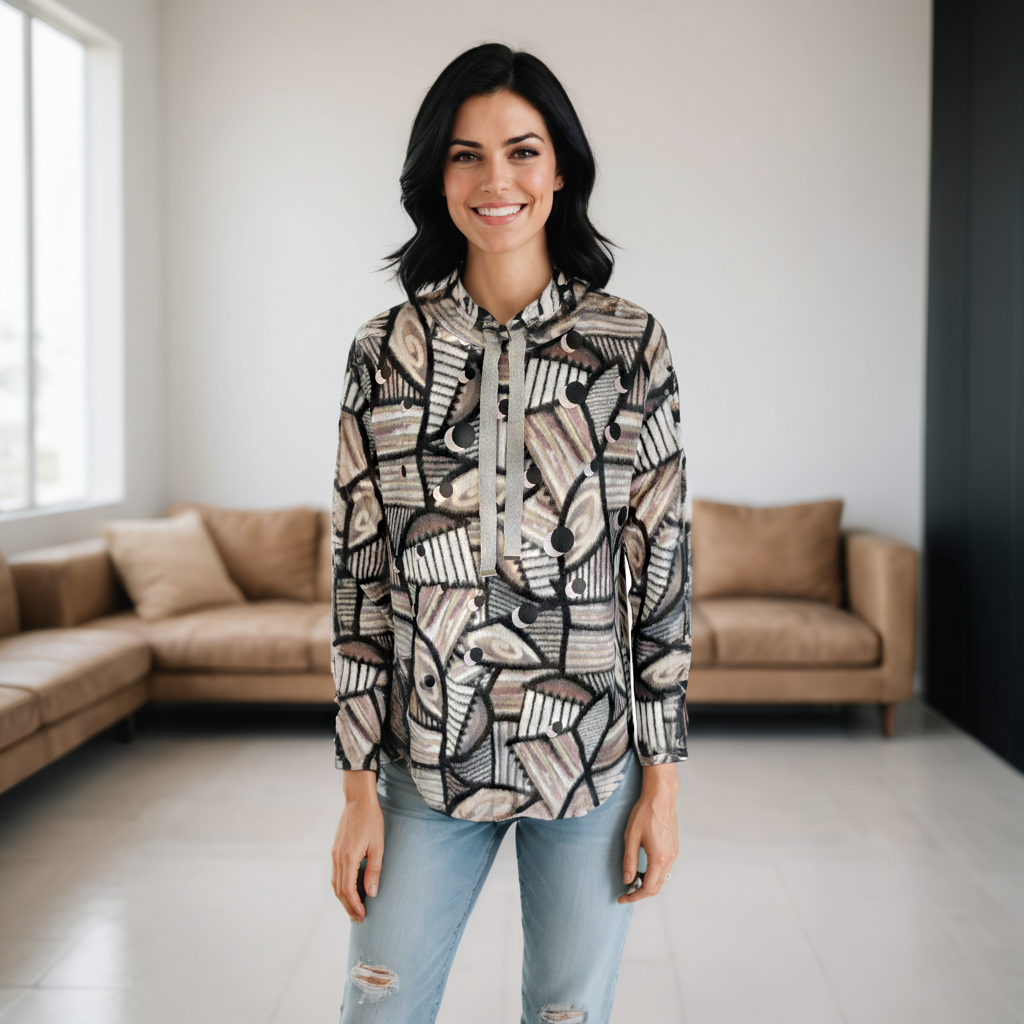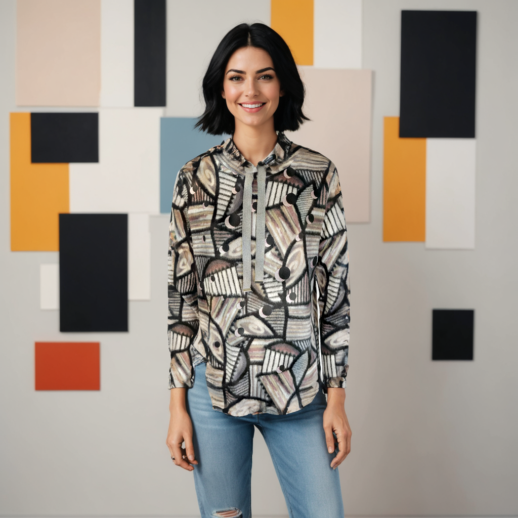 This top is made from a unique fabric we call Yummy, that is brushed for a super soft hand feel. It is a printed garment. Fit is more boxy in shape. It has a mock neck, which is a shorter version of a turtleneck. The neckline features a non-functional tie and it is hemmed at the sleeve opening and bottom opening.