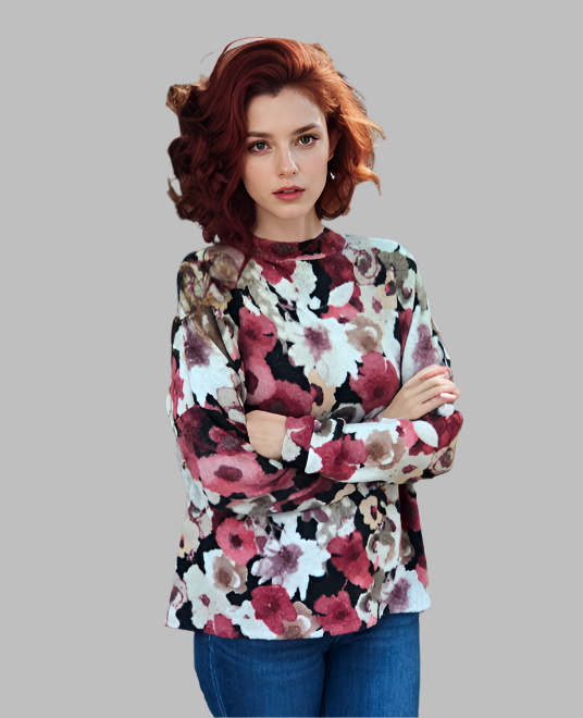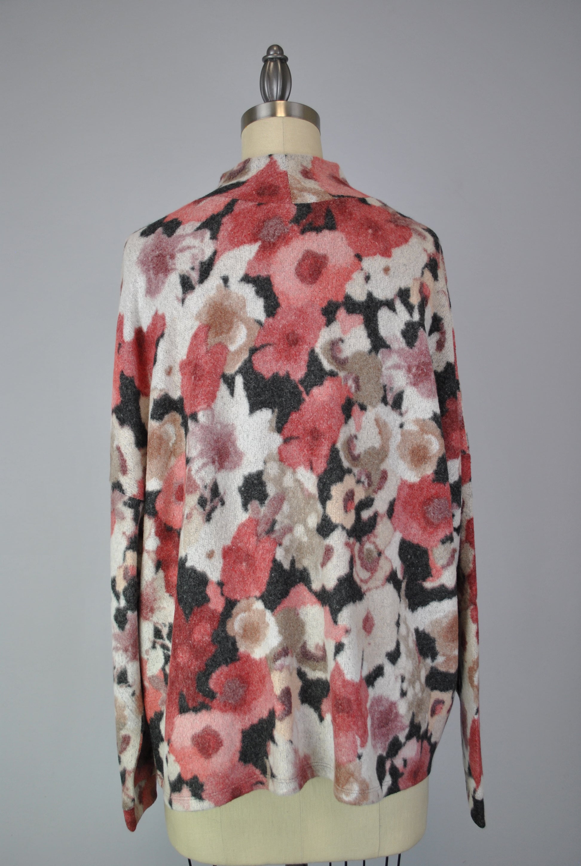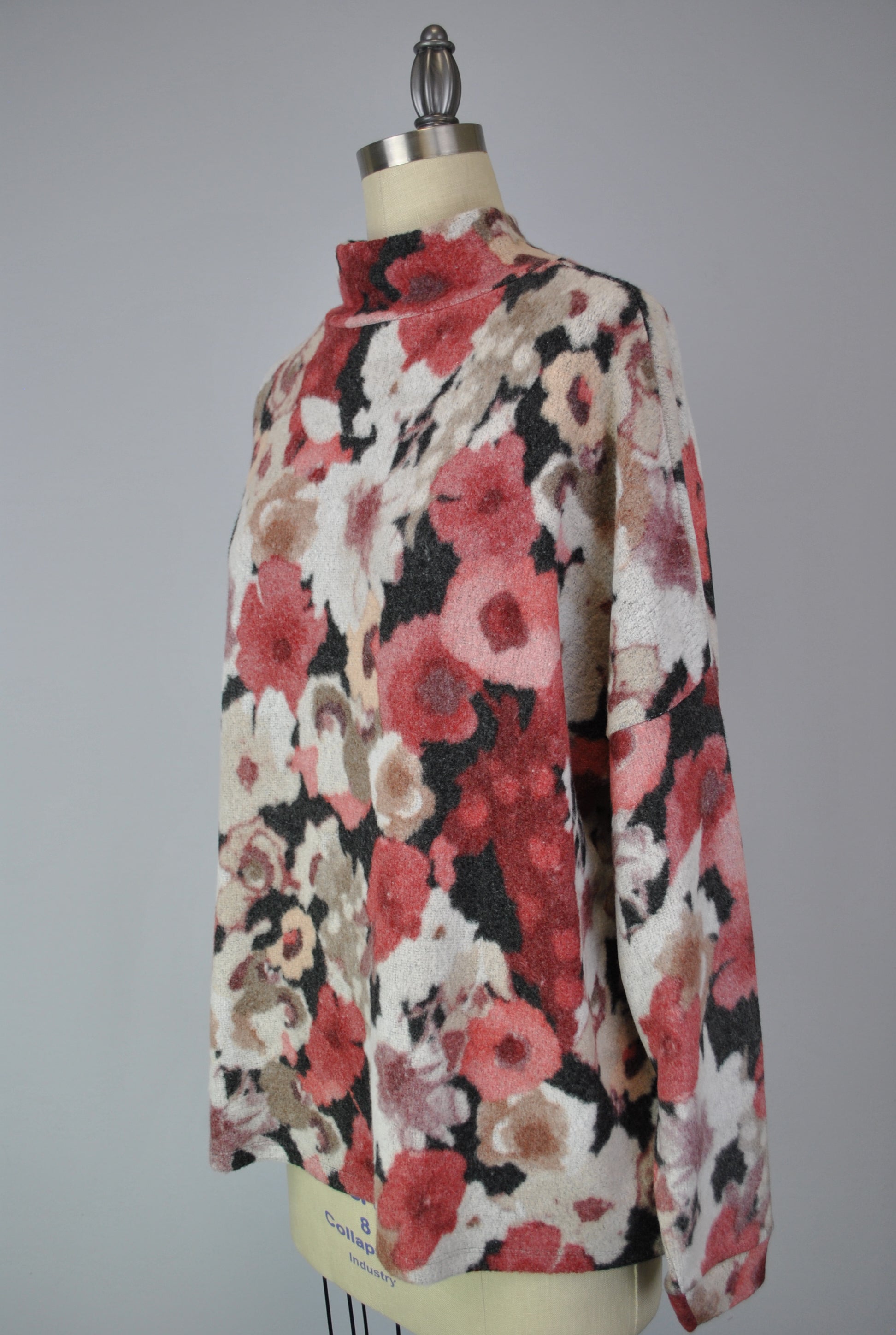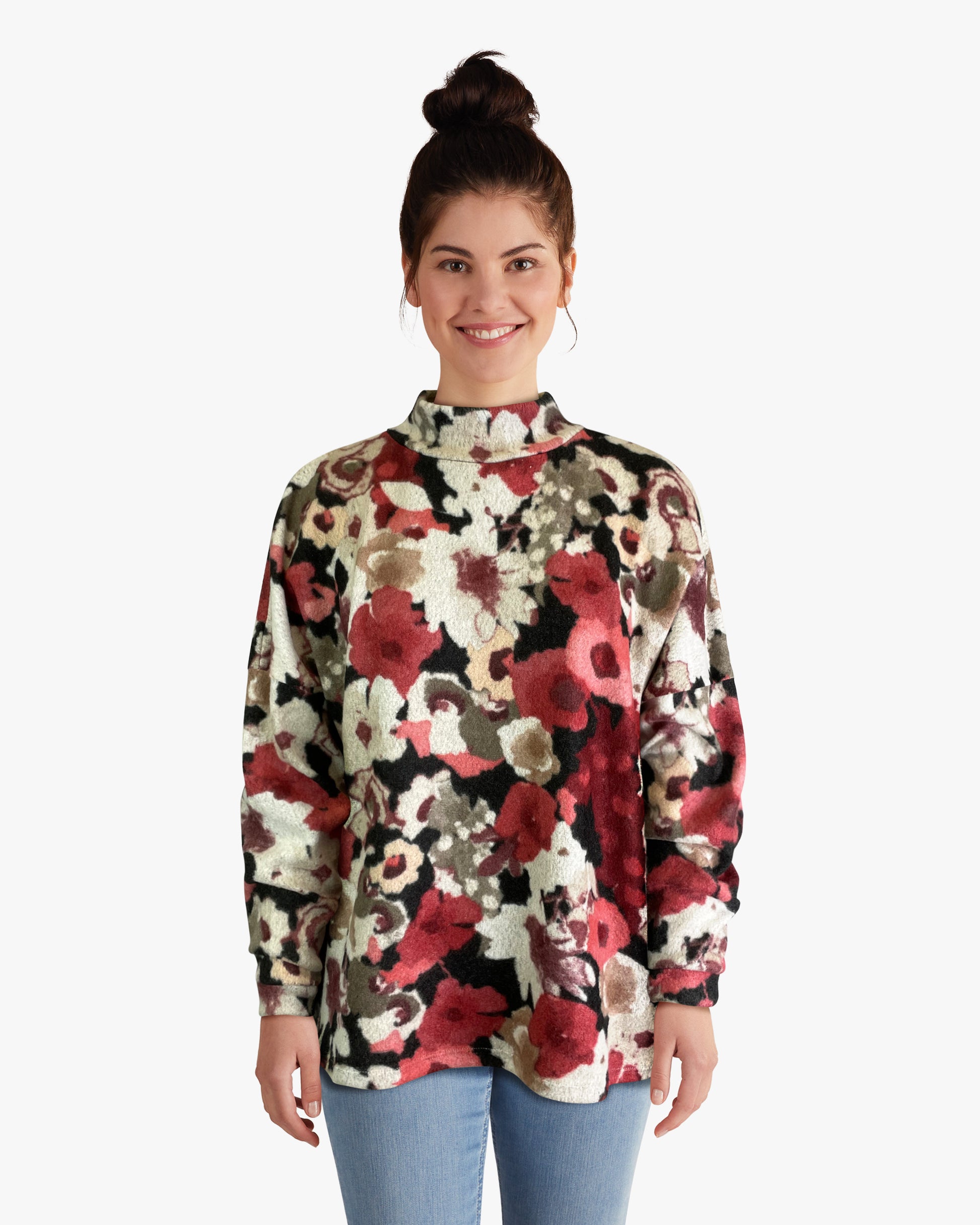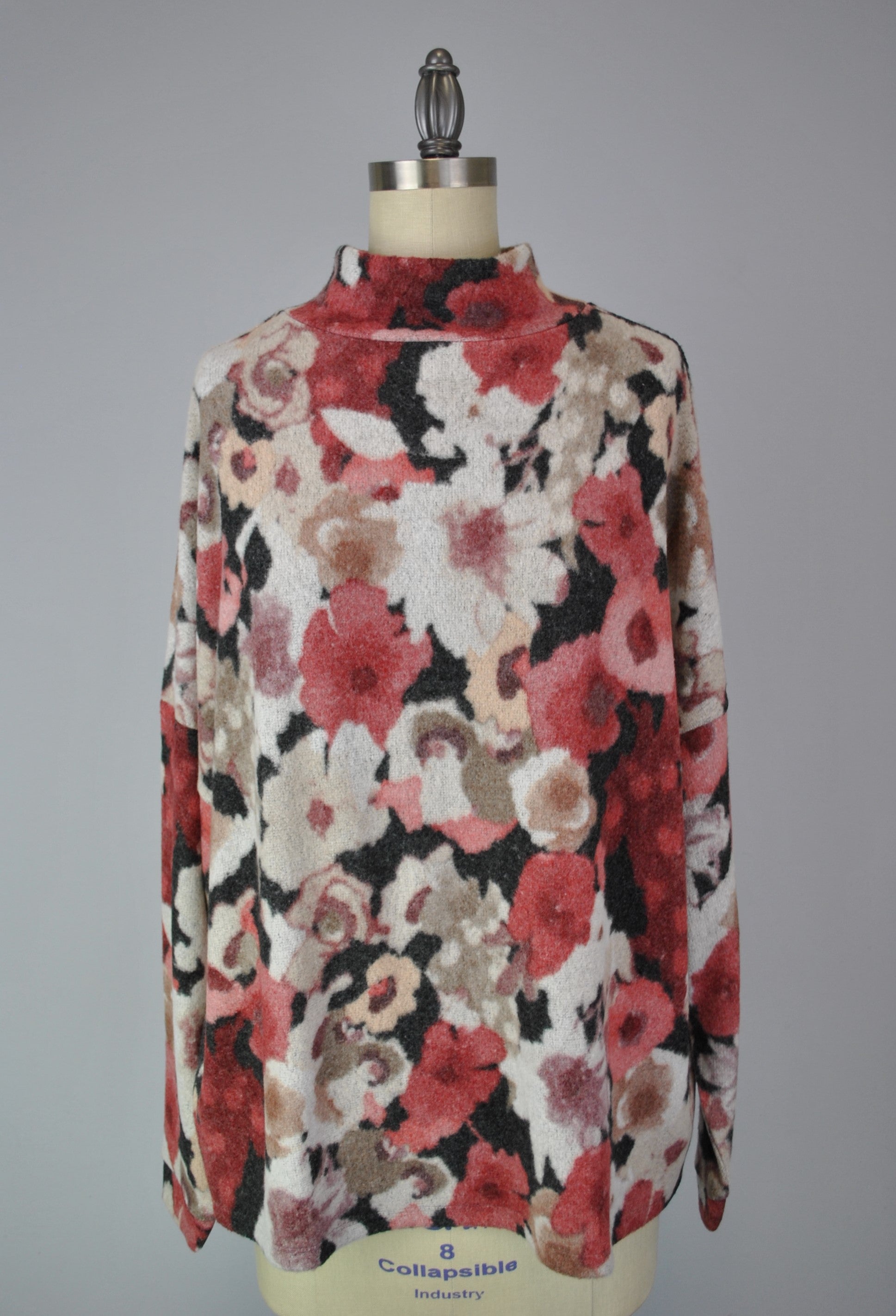 This top is made from a unique fabric we call Yummy, that is brushed for a super soft hand feel. Fit is oversized with drop shoulder. Garment has a mock neck and a self fabric cuff at the sleeve opening. The garment has a hem for finishing at bottom opening.