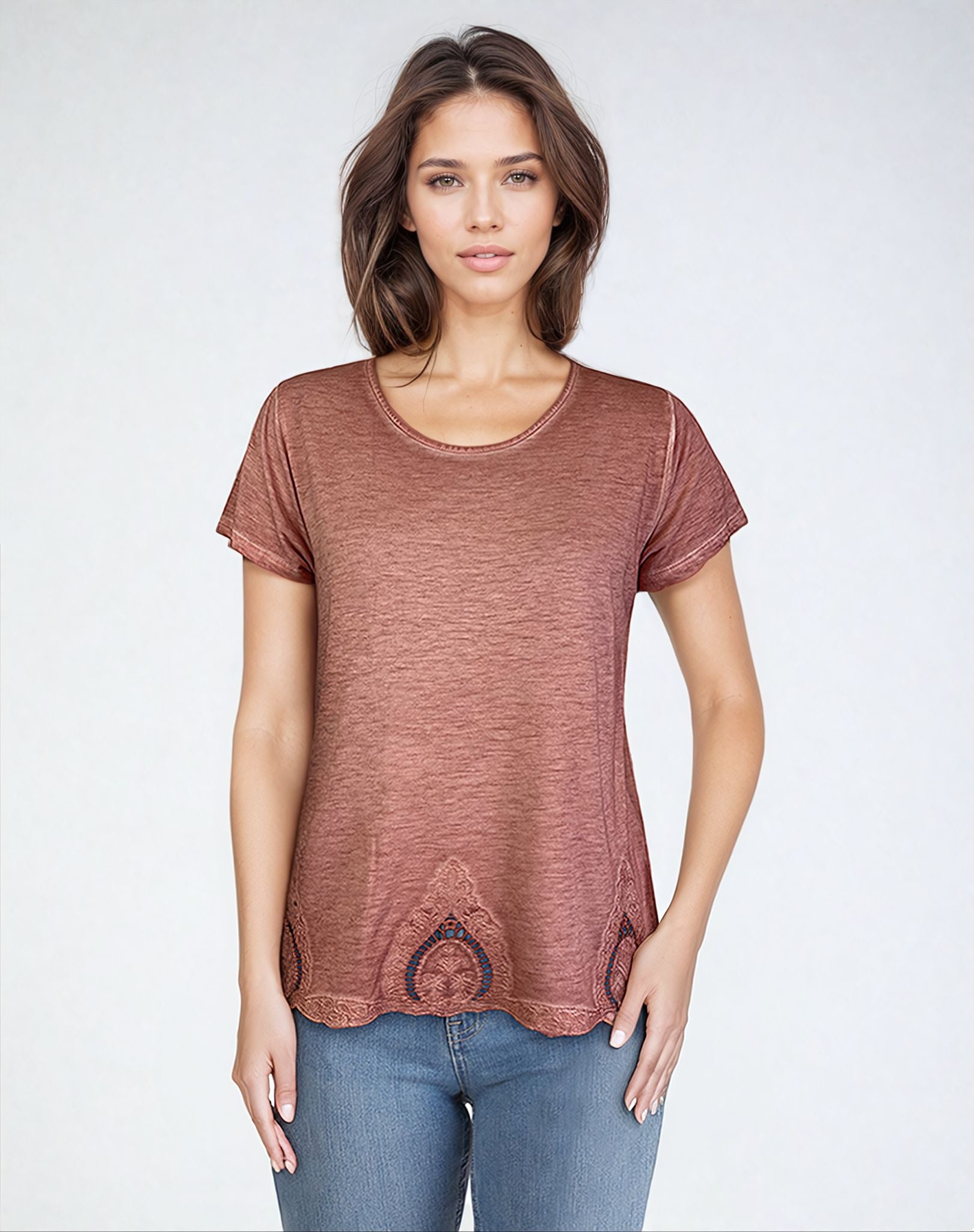 Short Sleeve Oil Dye Embroidered Hem Top (D190242) Sahara Sky