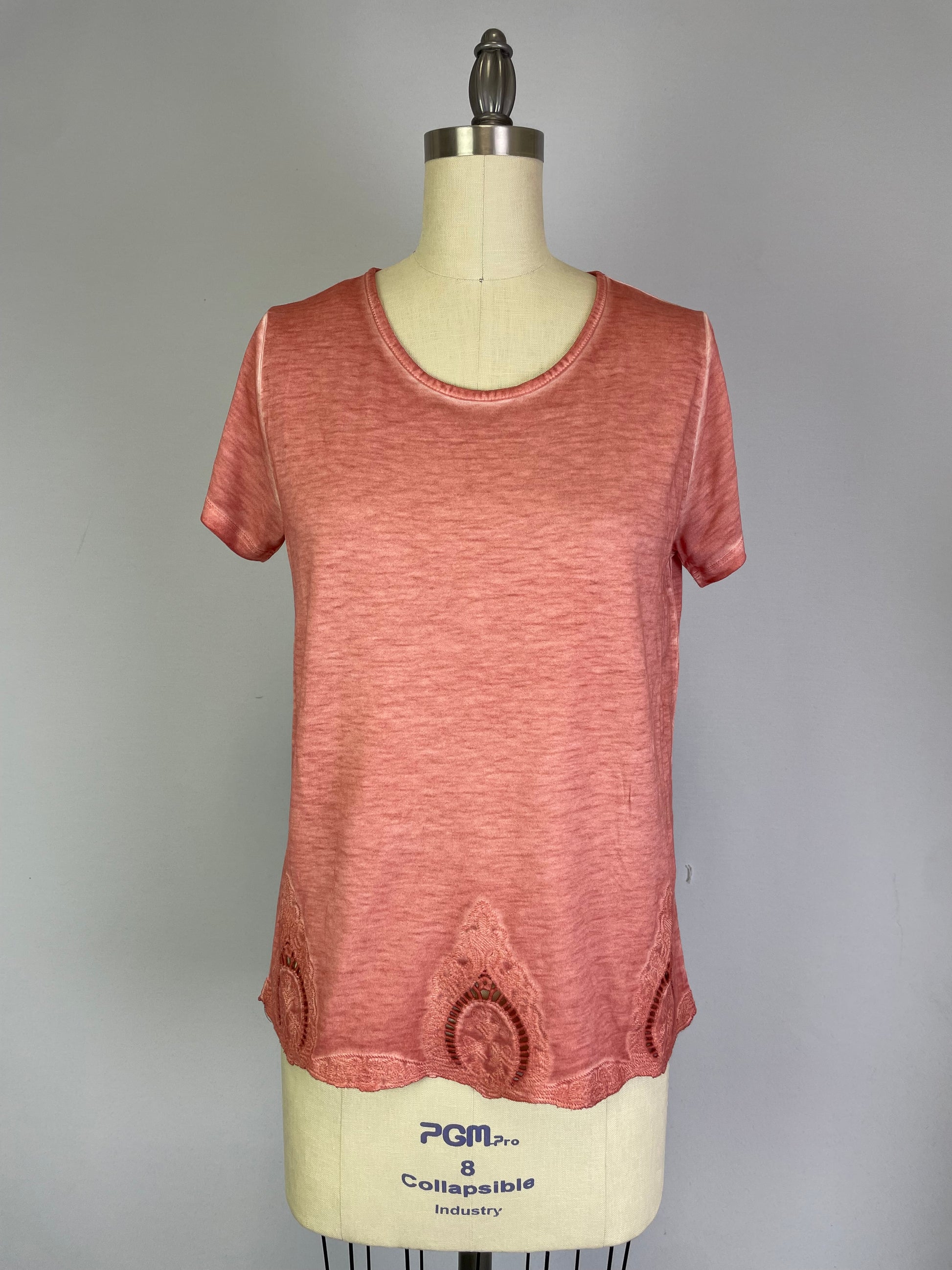 This Spring Top has a embroidered hem, scoop neck, and short sleeve. Finished with our signature oil dye process for a unique look. Fit is closer to the body with a set in sleeve.