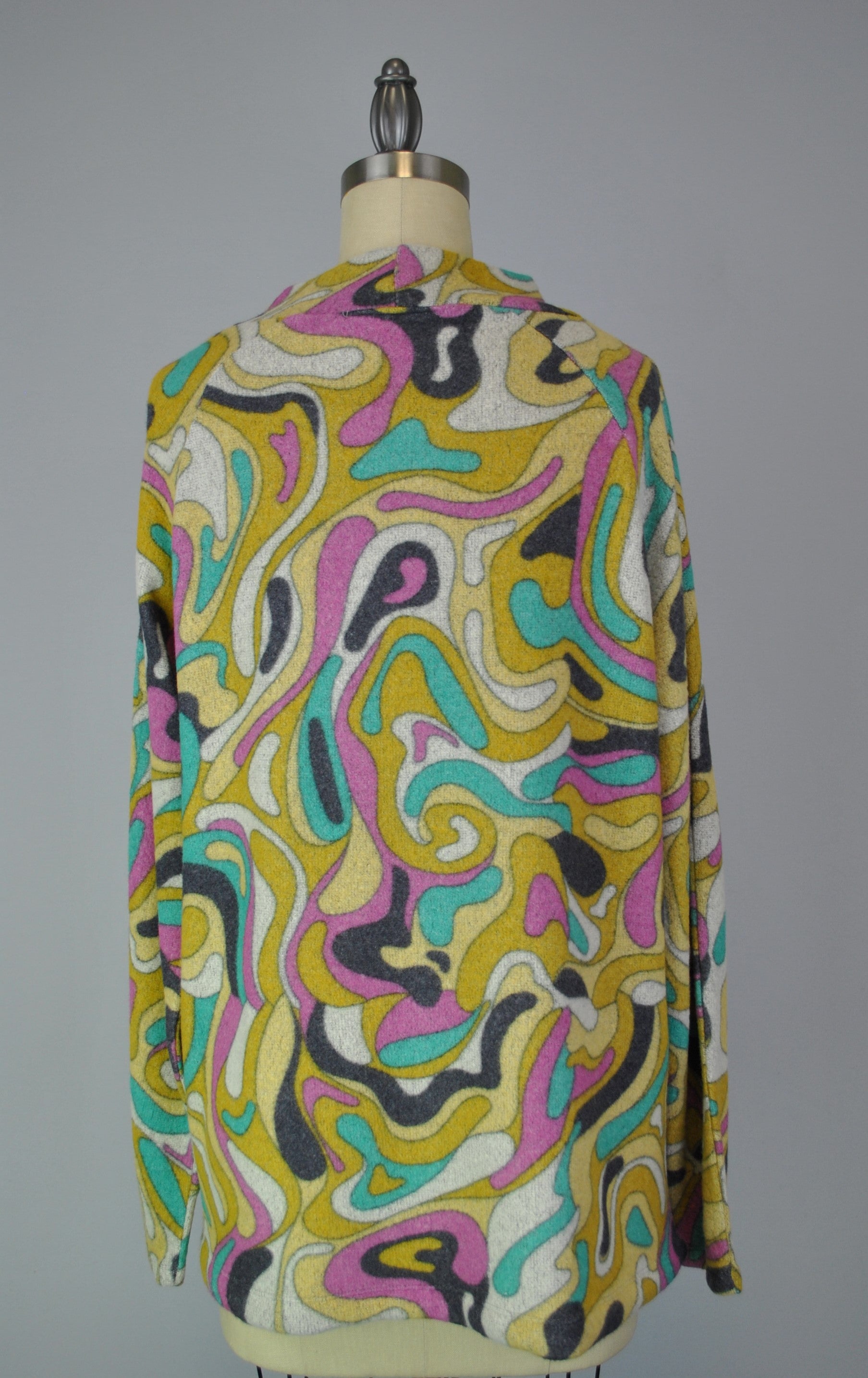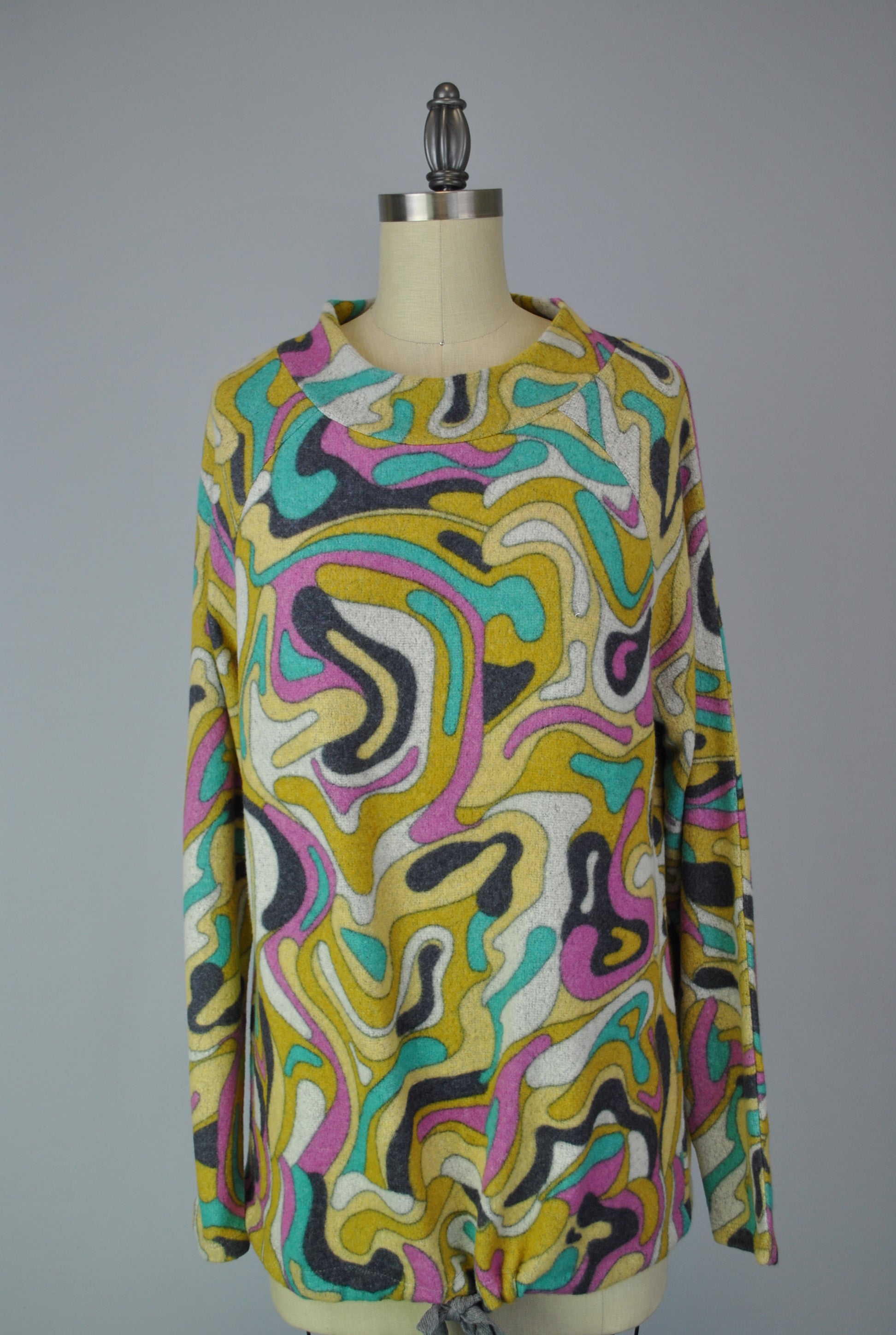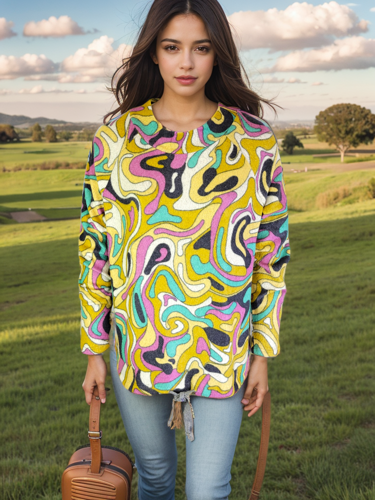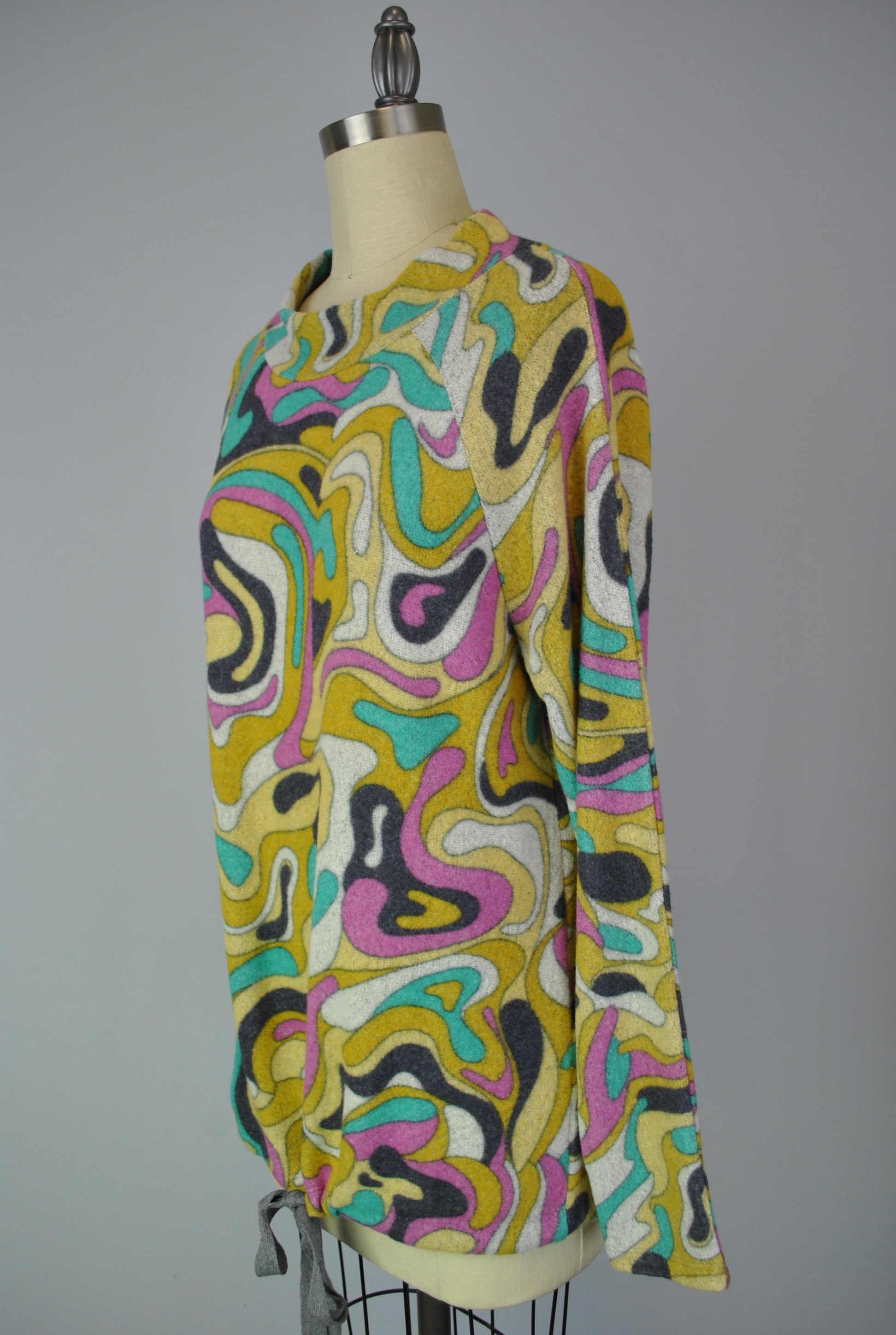 This top is made from a unique fabric we call Yummy, that is brushed for a super soft hand feel. The fabric is printed. The garment has an encased tie at the waist to cinch in the bottom opening to accent the waist. Garment overall has a relaxed feel.