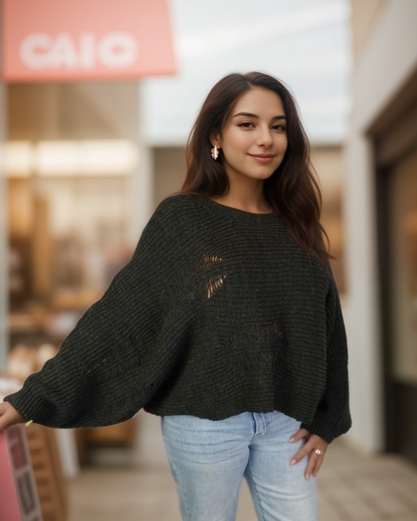 - Multiple Drop Stitches are used to add depth and design to the sweater giving a see thru effect.