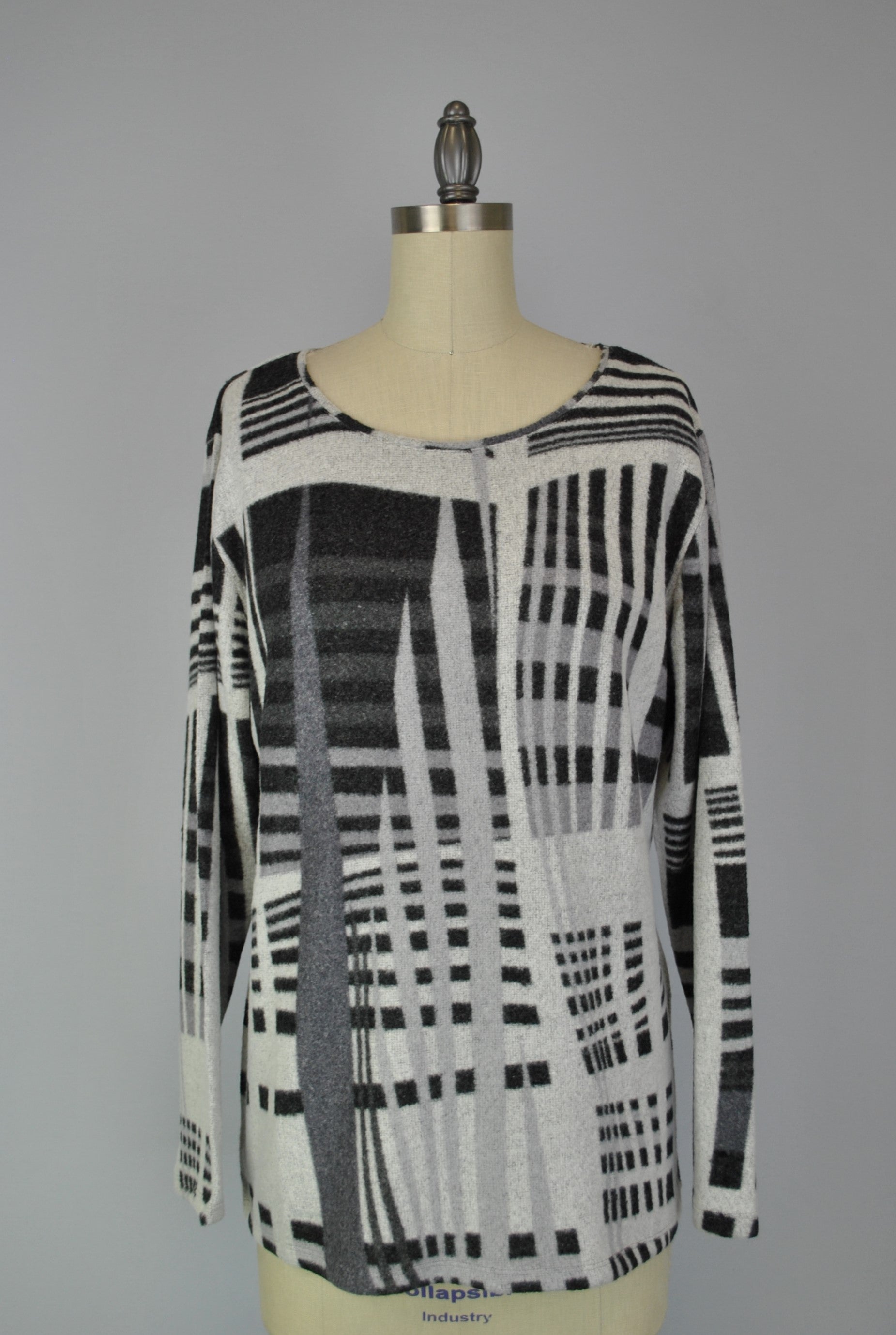 This top is made from a unique fabric we call Yummy, that is brushed for a super soft hand feel. It is a printed garment. Fit is relaxed but closer to the body in shape. It has a scoop neckline and is hemmed at the sleeve opening and bottom opening.
