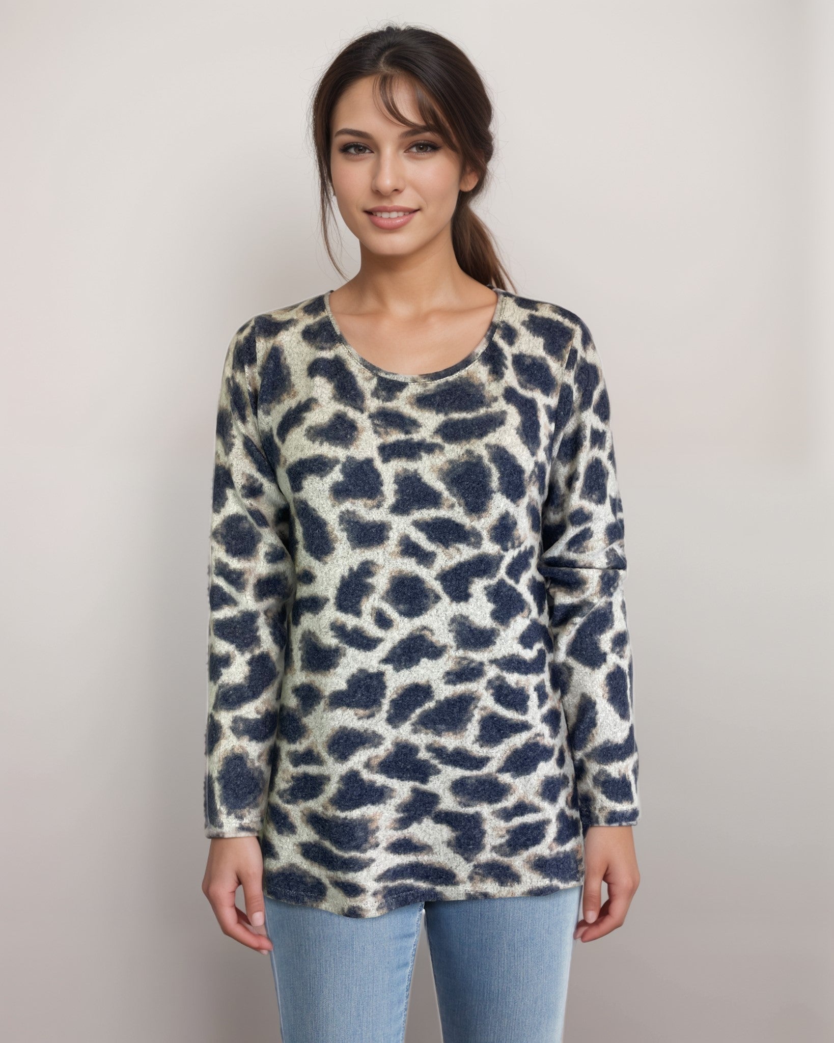This top is made from a unique fabric we call Yummy, that is brushed for a super soft hand feel. The fabric is printed prior to brushing. It is long sleeve and has a slimmer fit. It sits slightly off the shoulder and is easy to pull over the head. The neck line is scoop in shape with self fabric finish.