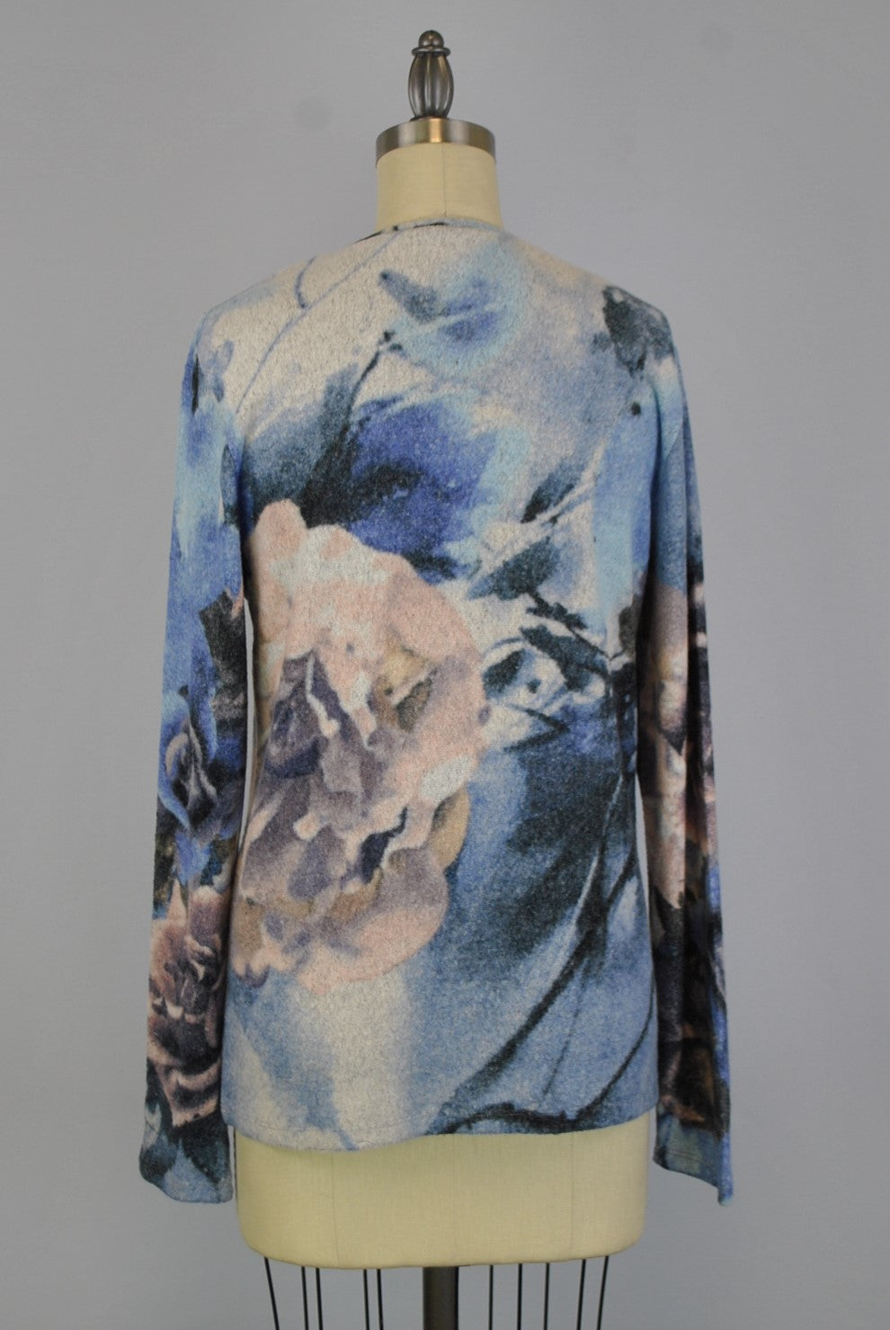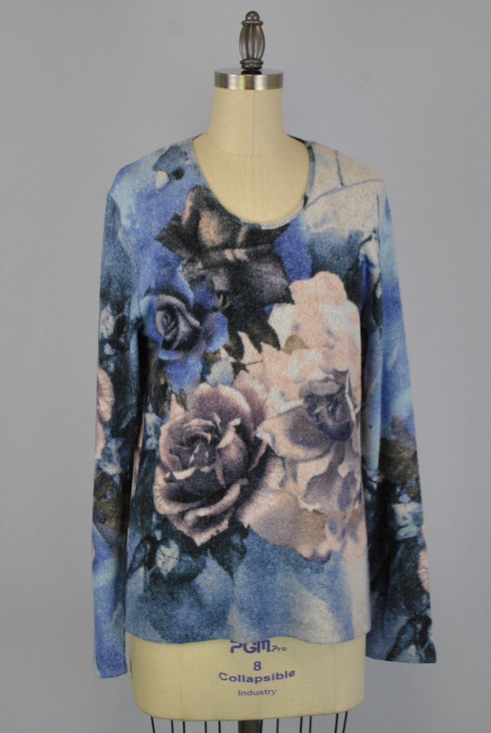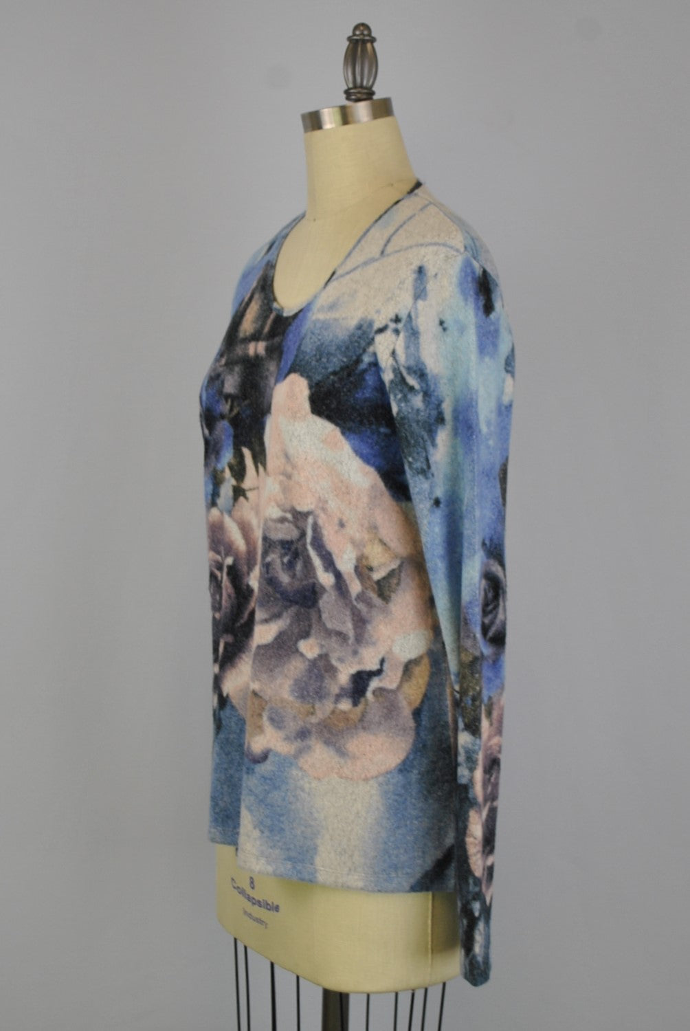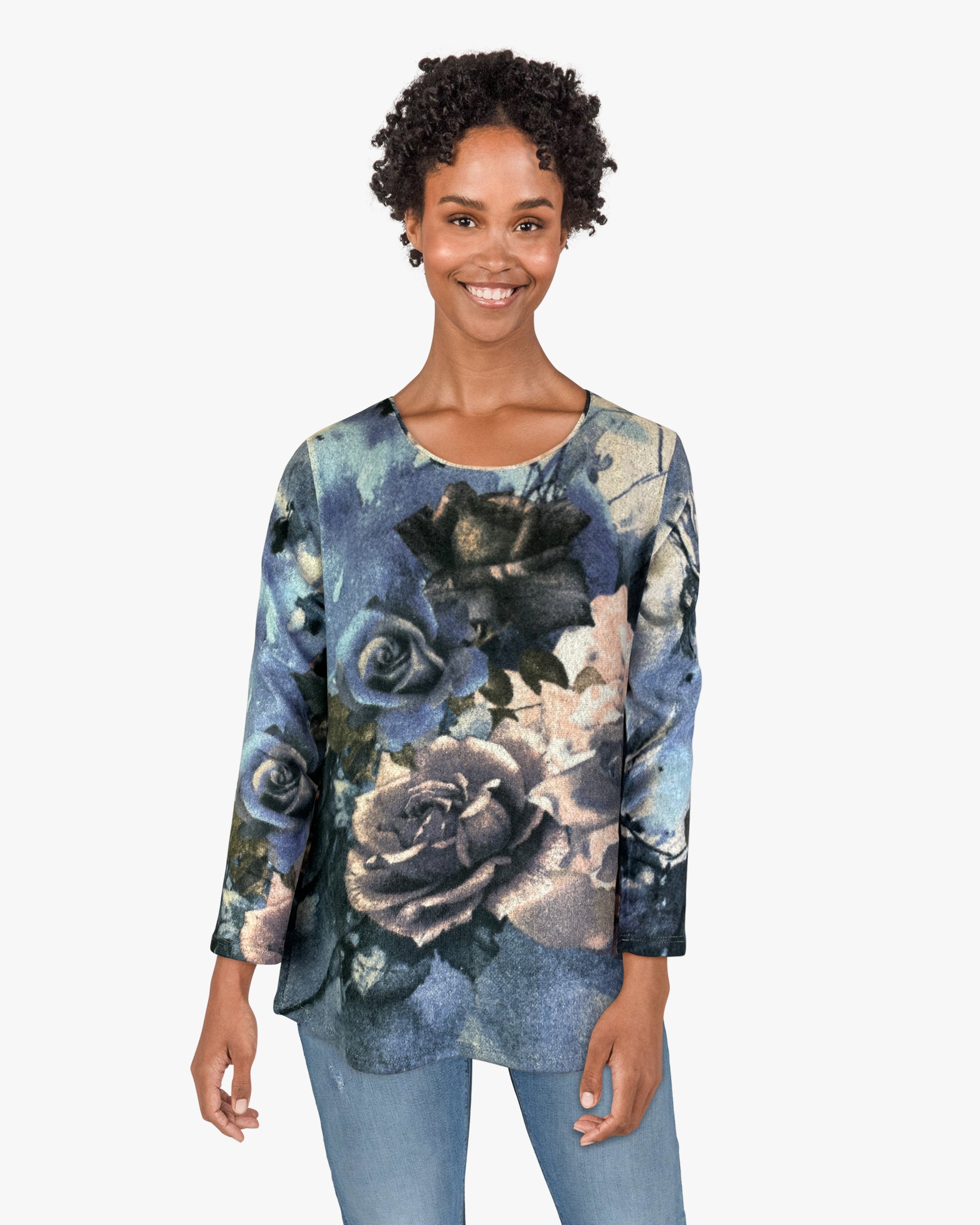 This top is made from a unique fabric we call Yummy, that is brushed for a super soft hand feel. The fabric is printed prior to brushing. It is long sleeve and has a slimmer fit. It sits slightly off the shoulder and is easy to pull over the head. The neck line is scoop in shape with self fabric finish.