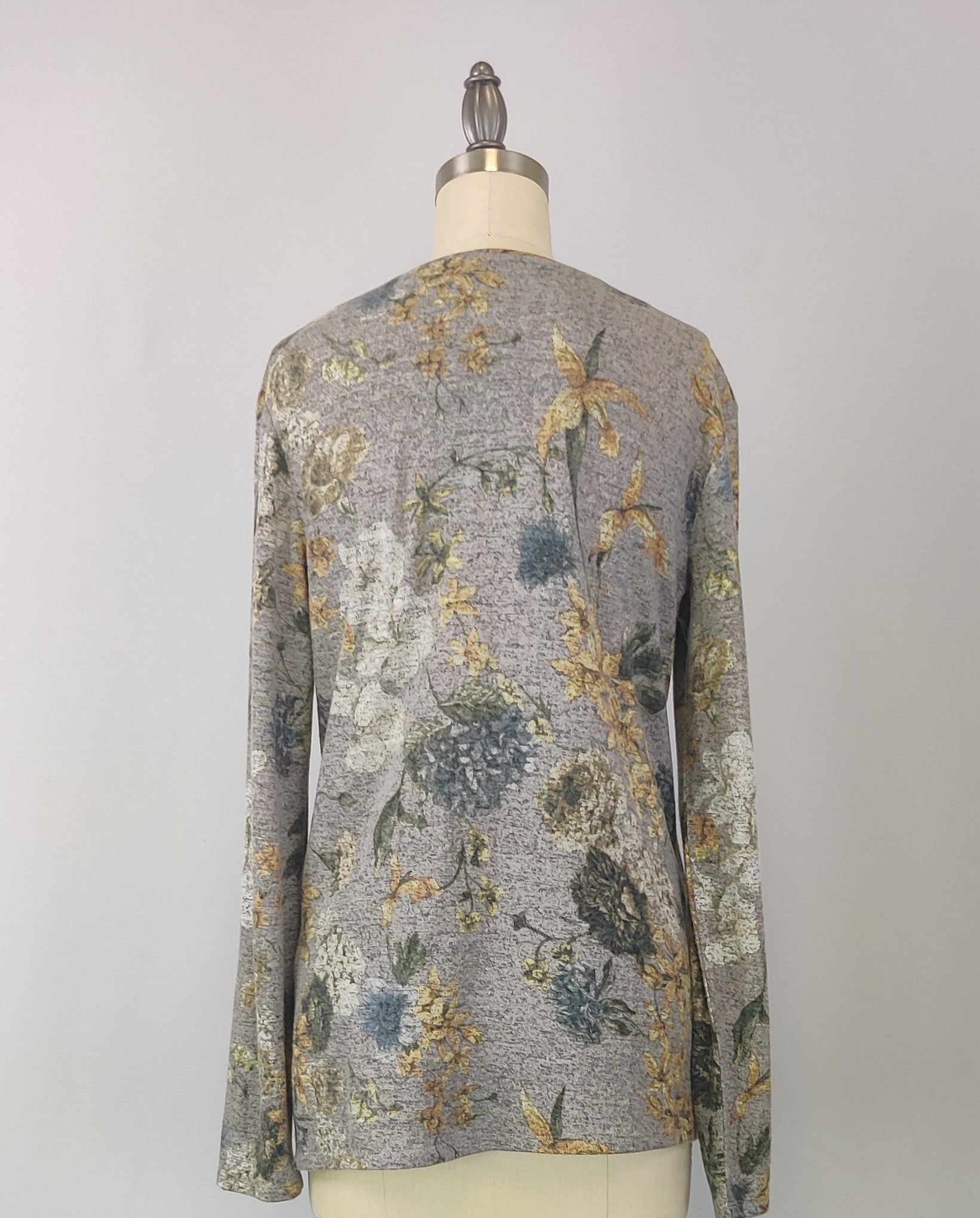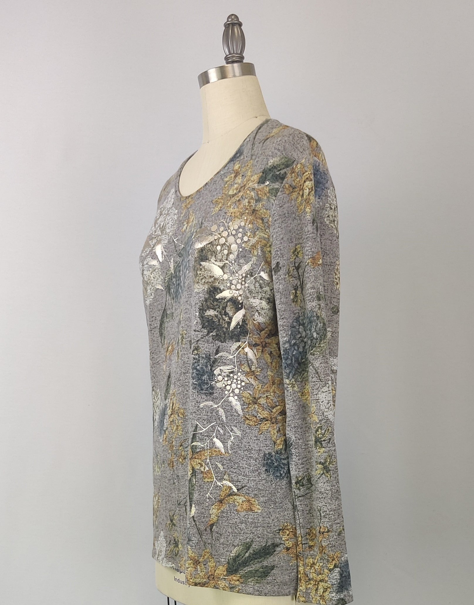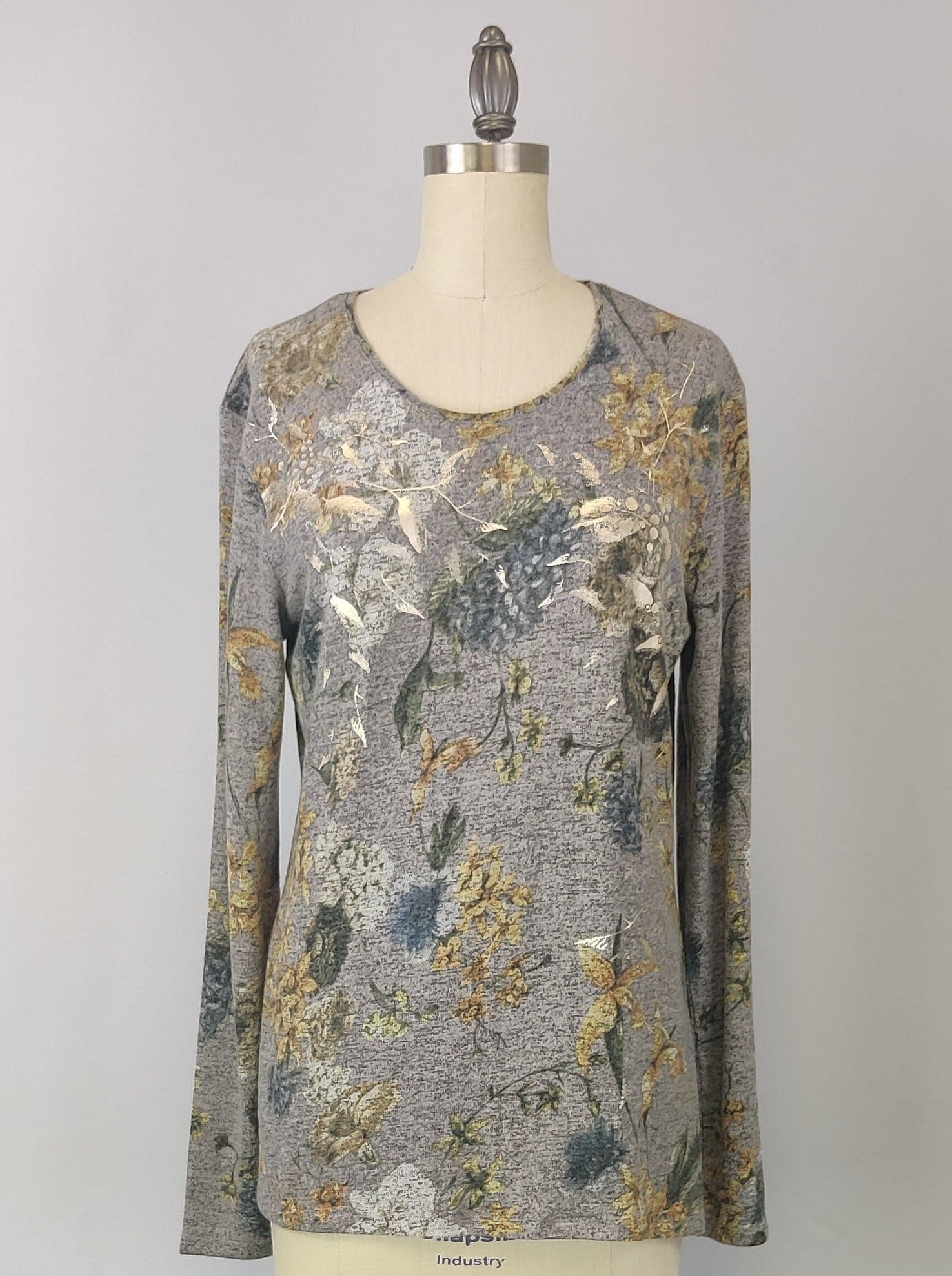 This top is made from a unique fabric we call Yummy, that is brushed for a super soft hand feel. The garment then has a foil screen overlay to give some shine to the print. Fit is relaxed but closer to the body in shape. It has a scoop neckline and is hemmed at the sleeve opening and bottom opening. Pairs great with skinny jeans.