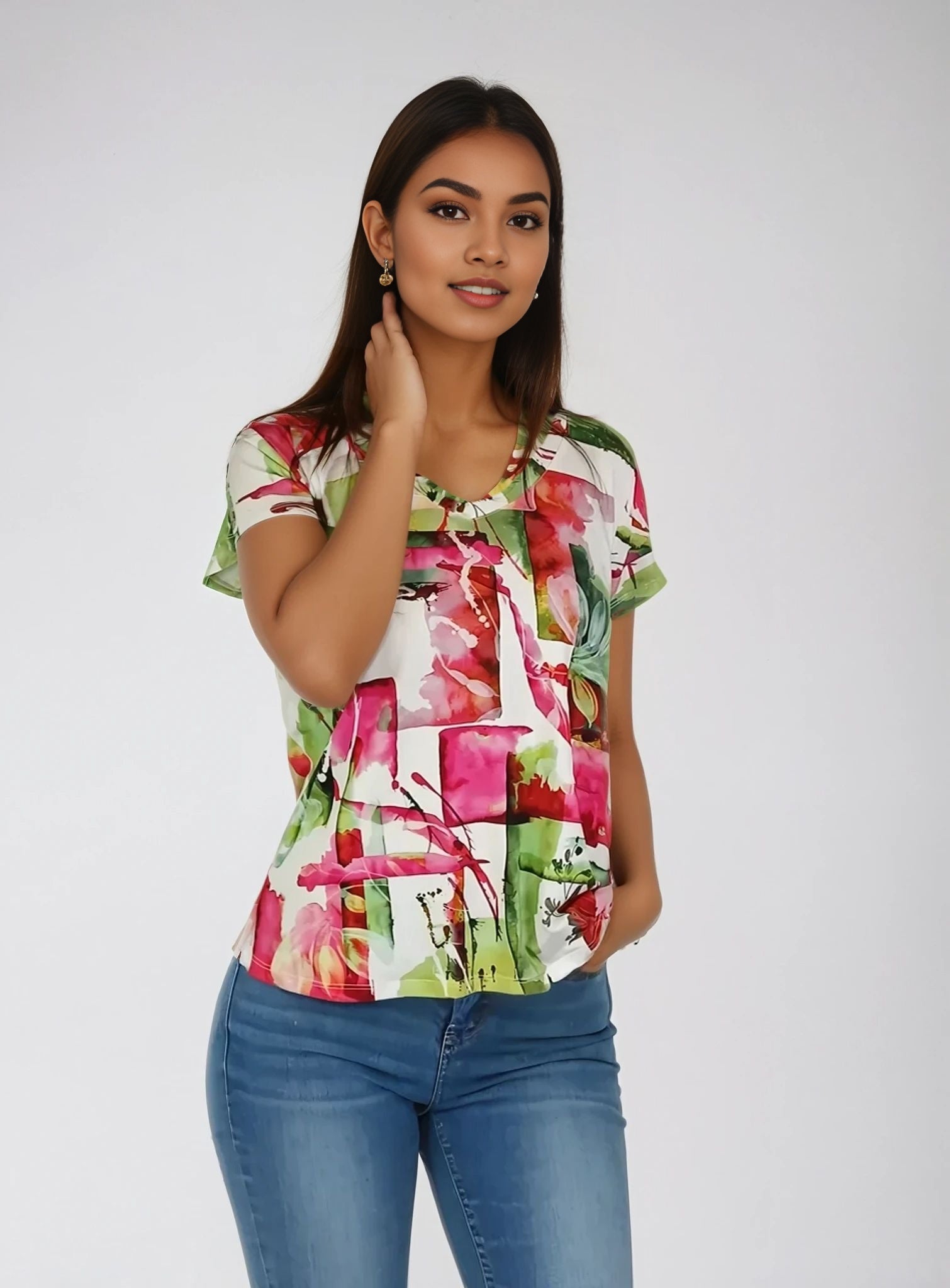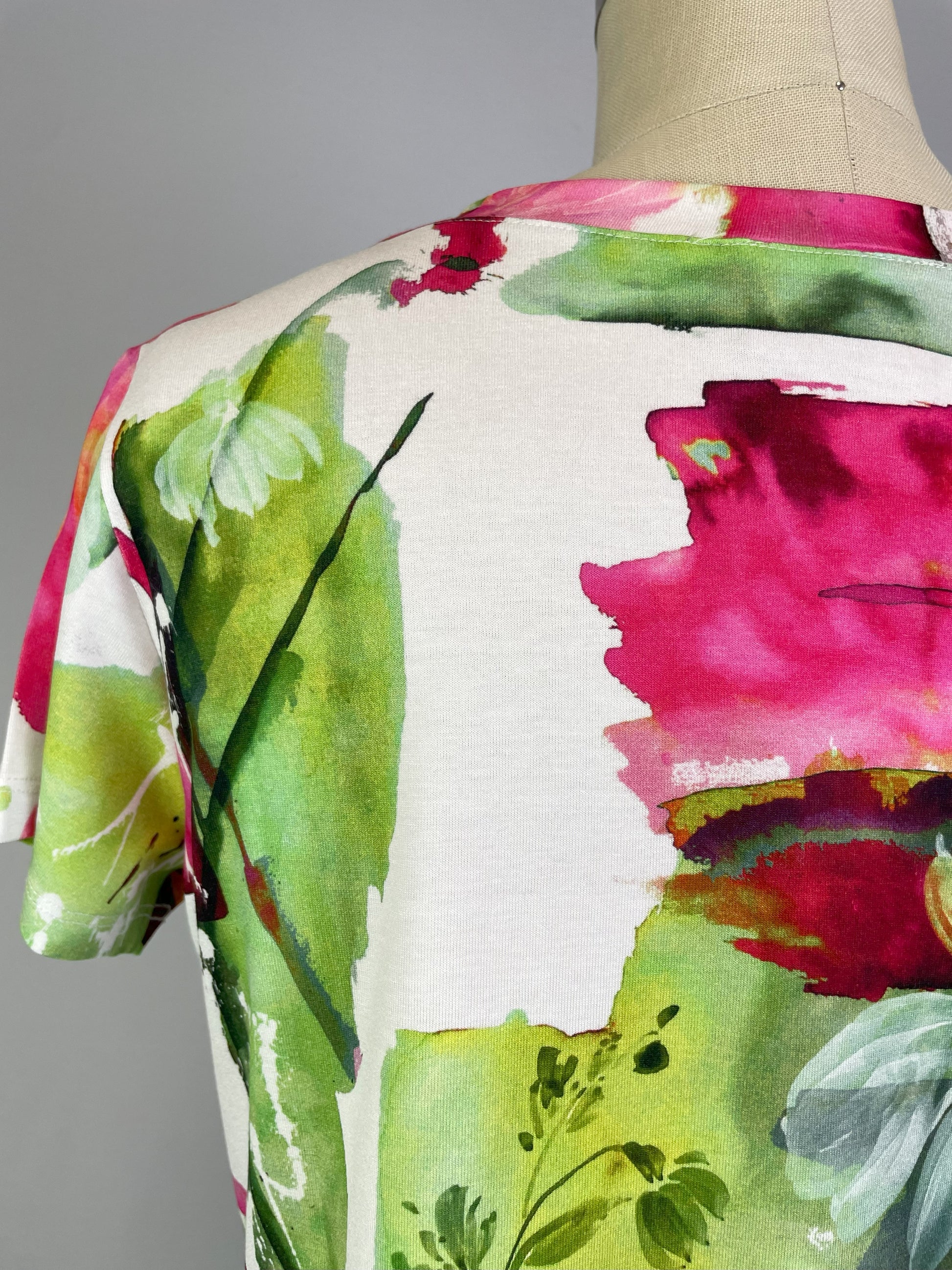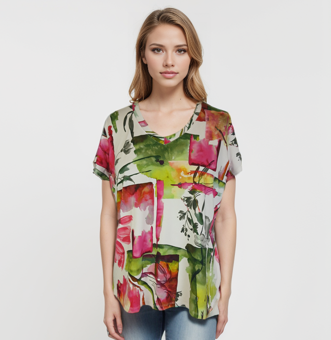 Women's printed knit Top.  Sleeve is a bit longer, alongside a more relaxed shoulder. Garment is hemmed at the sleeve and bottom opening.