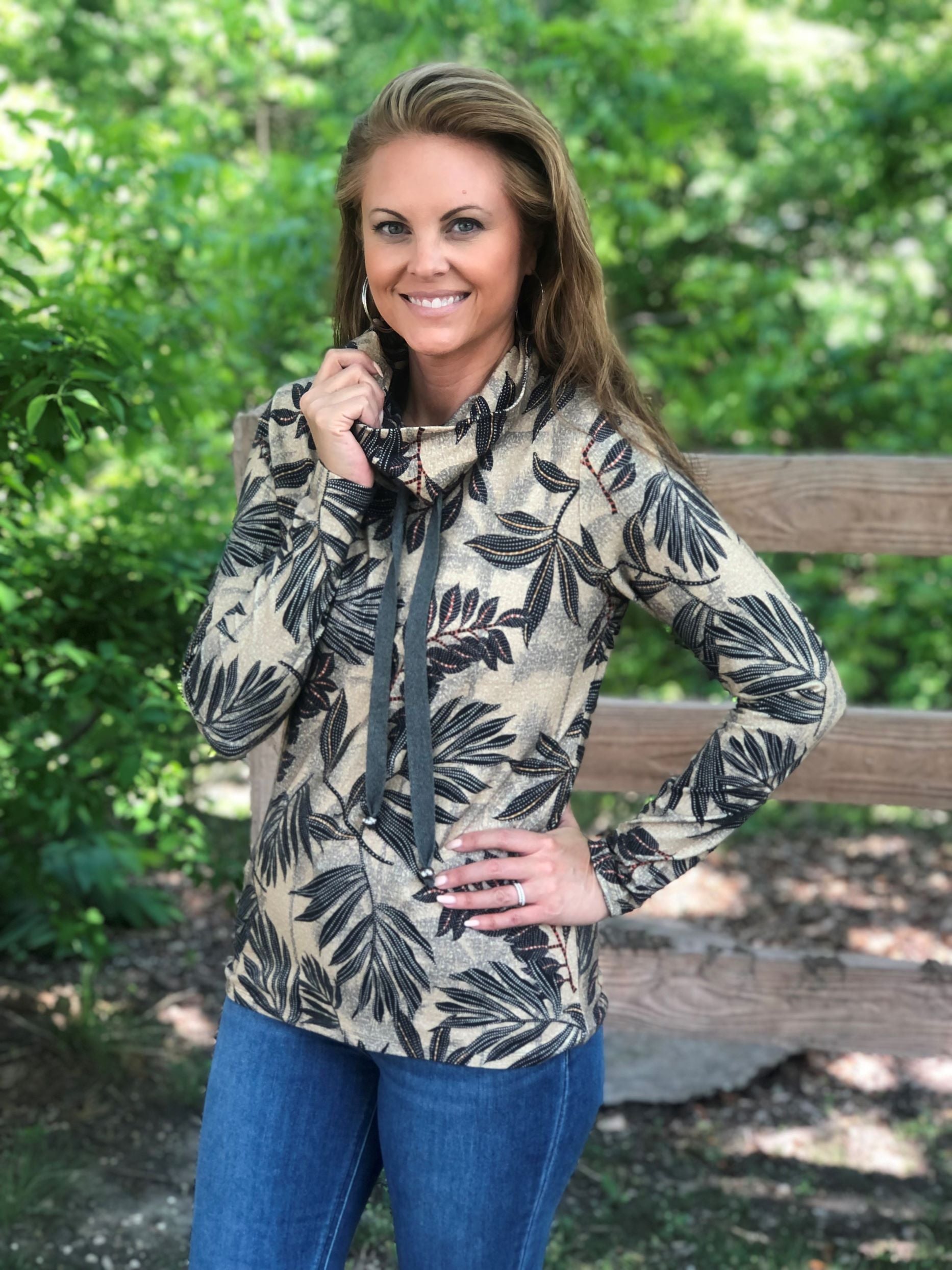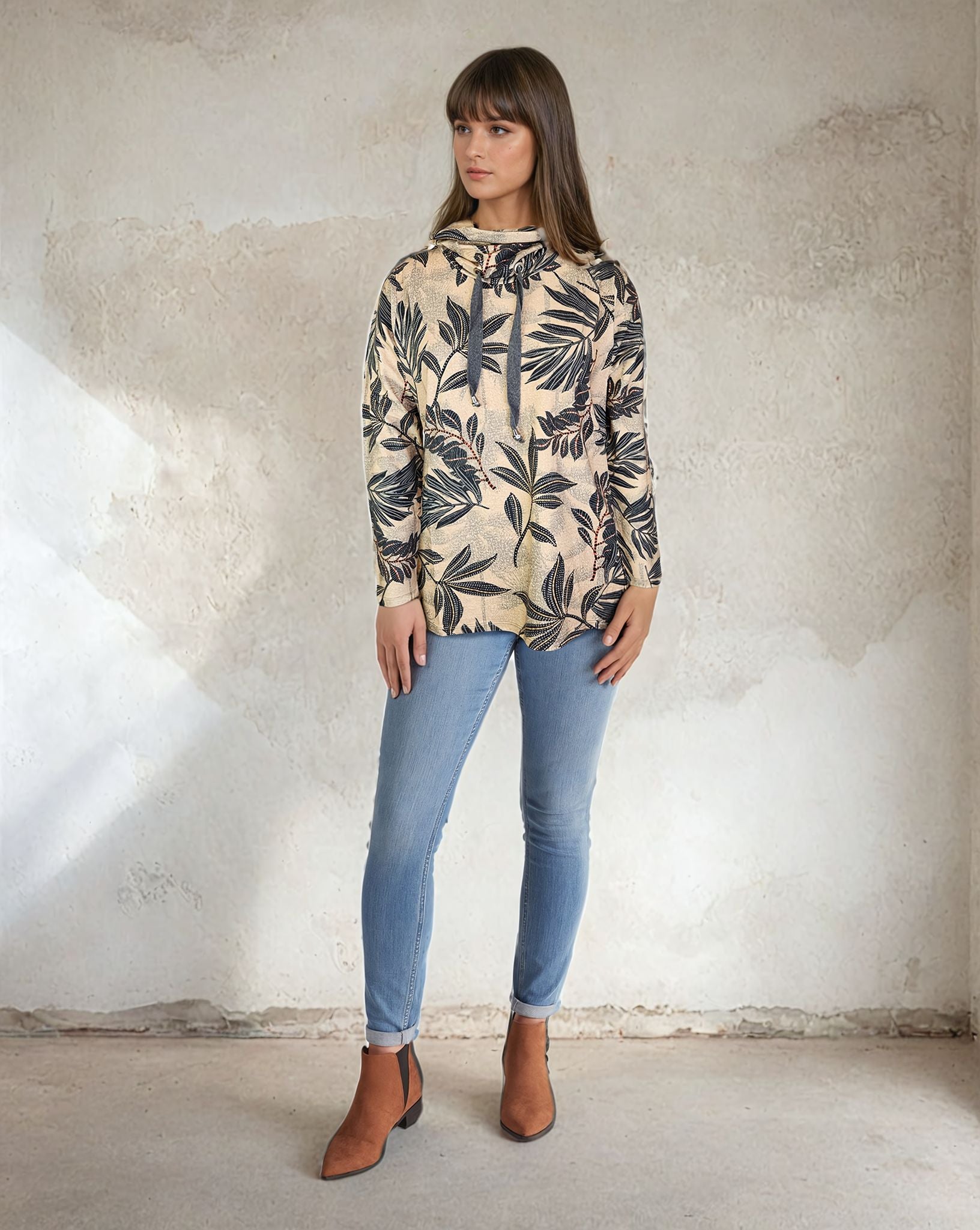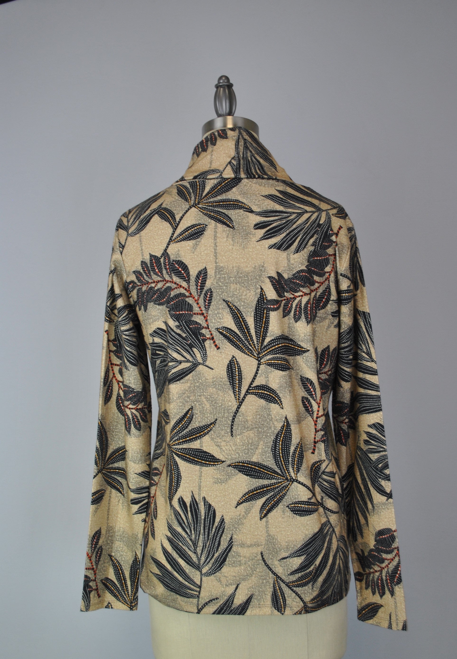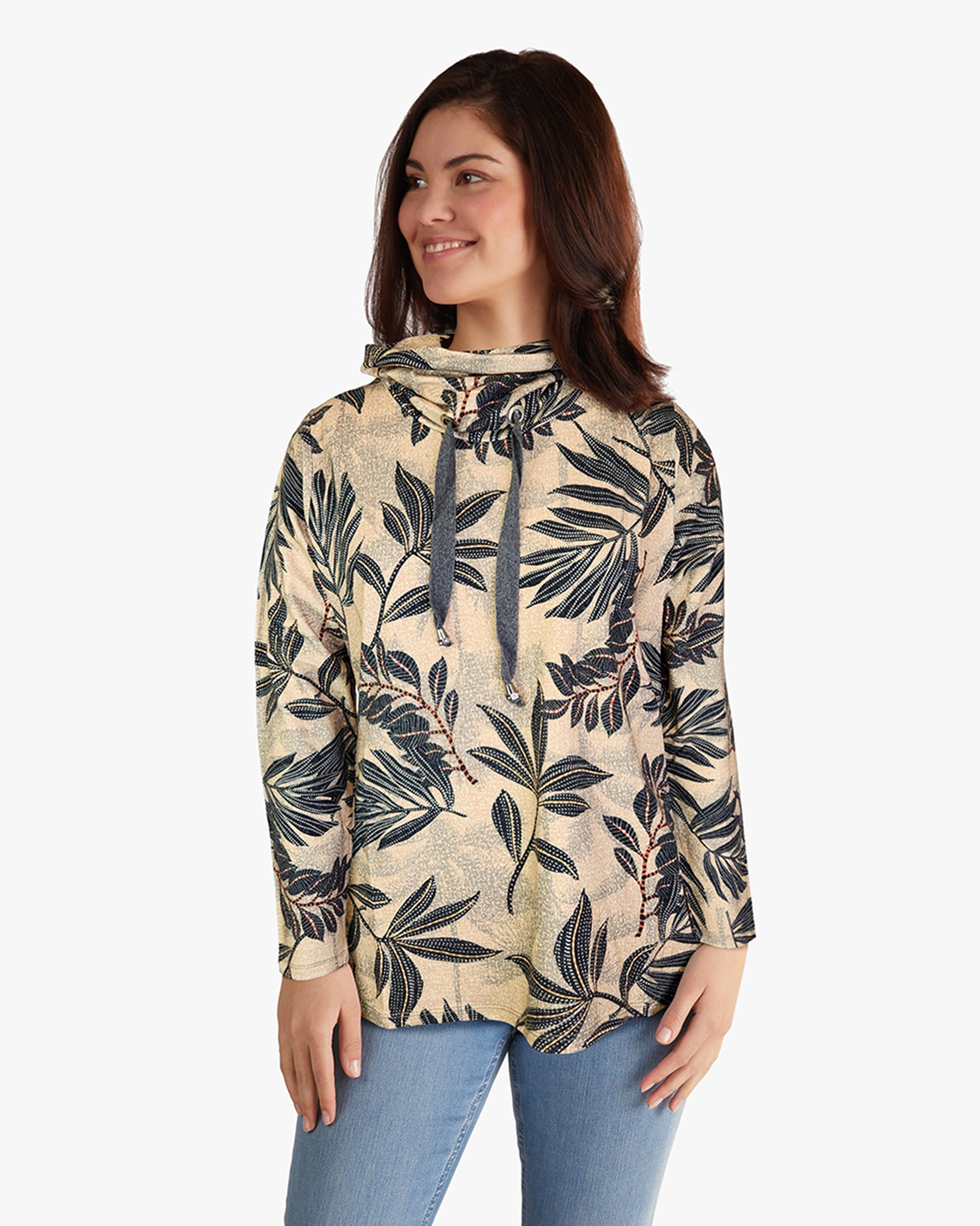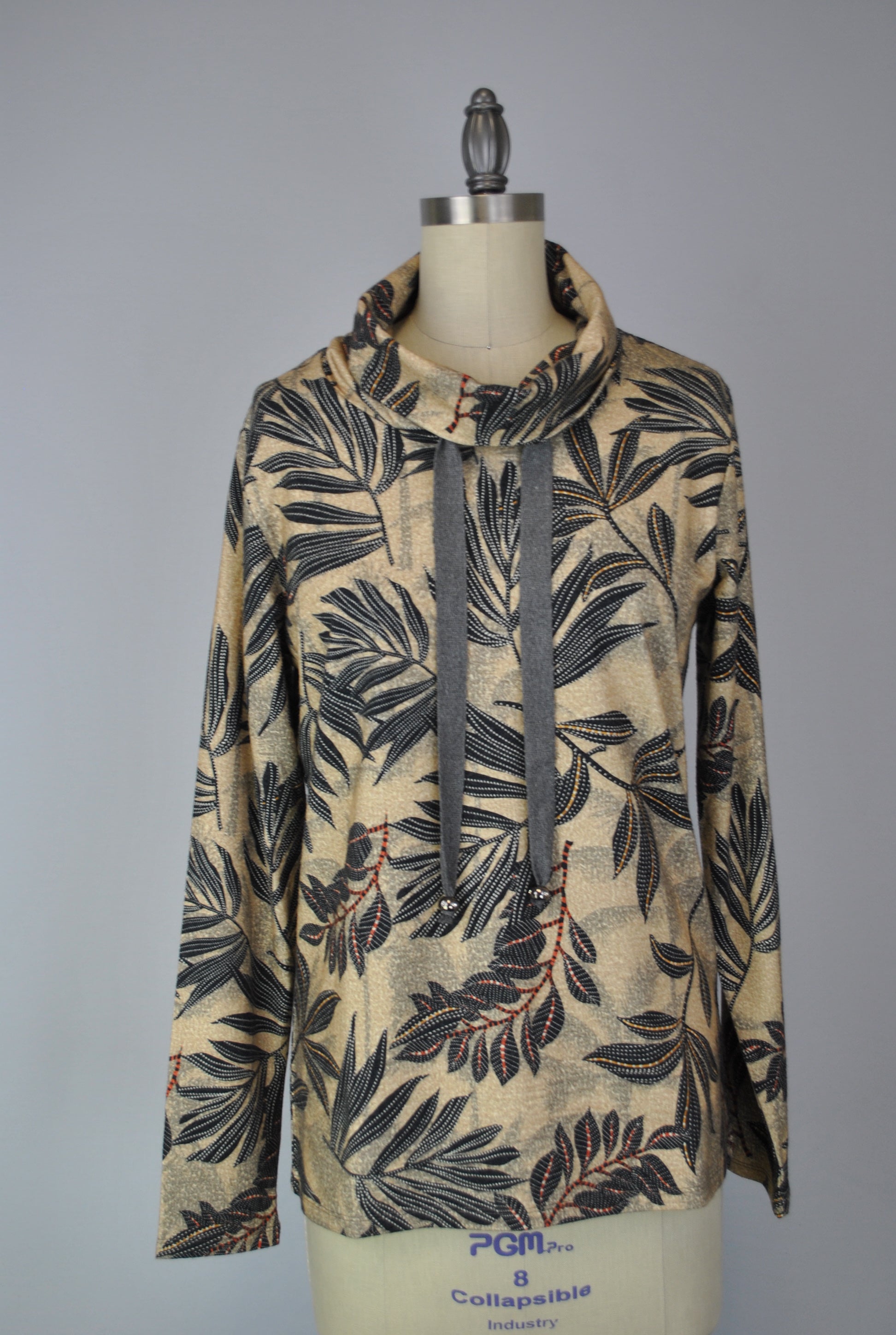 This top is made from a unique fabric we call Yummy, that is brushed for a super soft hand feel. It is a printed garment. Fit is relaxed but closer to the body in shape. It has a soft fold over fabric loose neckline and is hemmed at the sleeve opening and bottom opening.