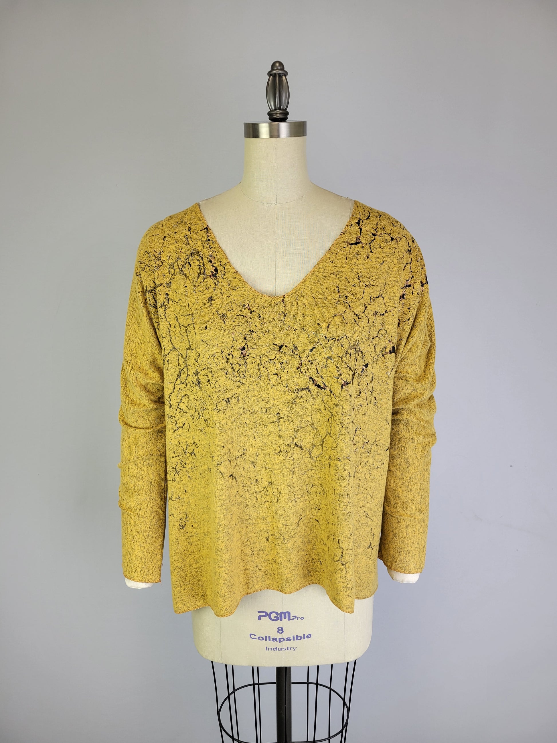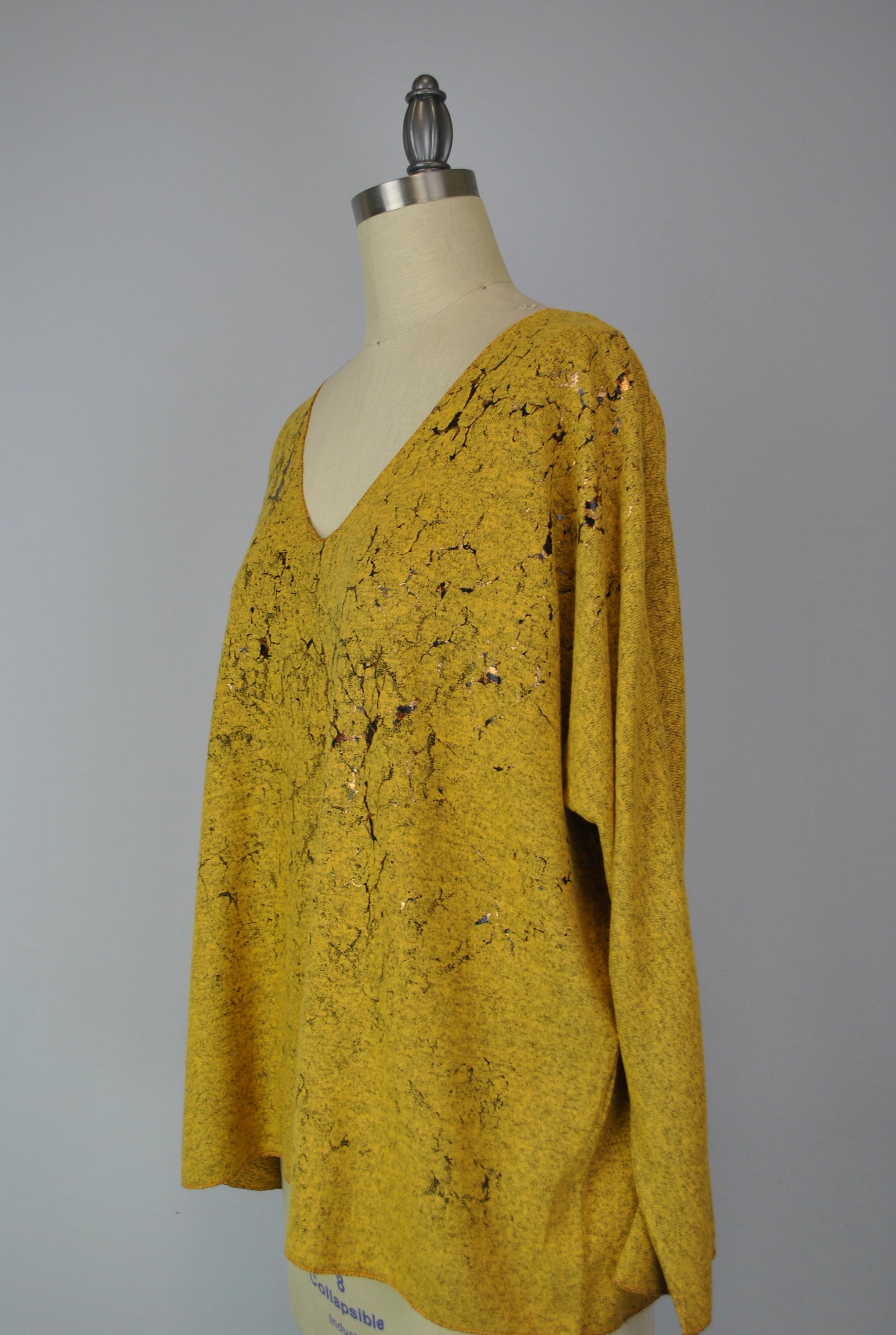This top is made from a unique fabric we call Yummy, that is brushed for a super soft hand feel. It is a printed garment. Fit is more boxy in shape. There is a copper foil design on the front of garment. It has a V-neck, and has special stitching detail at the sleeve opening and bottom opening.