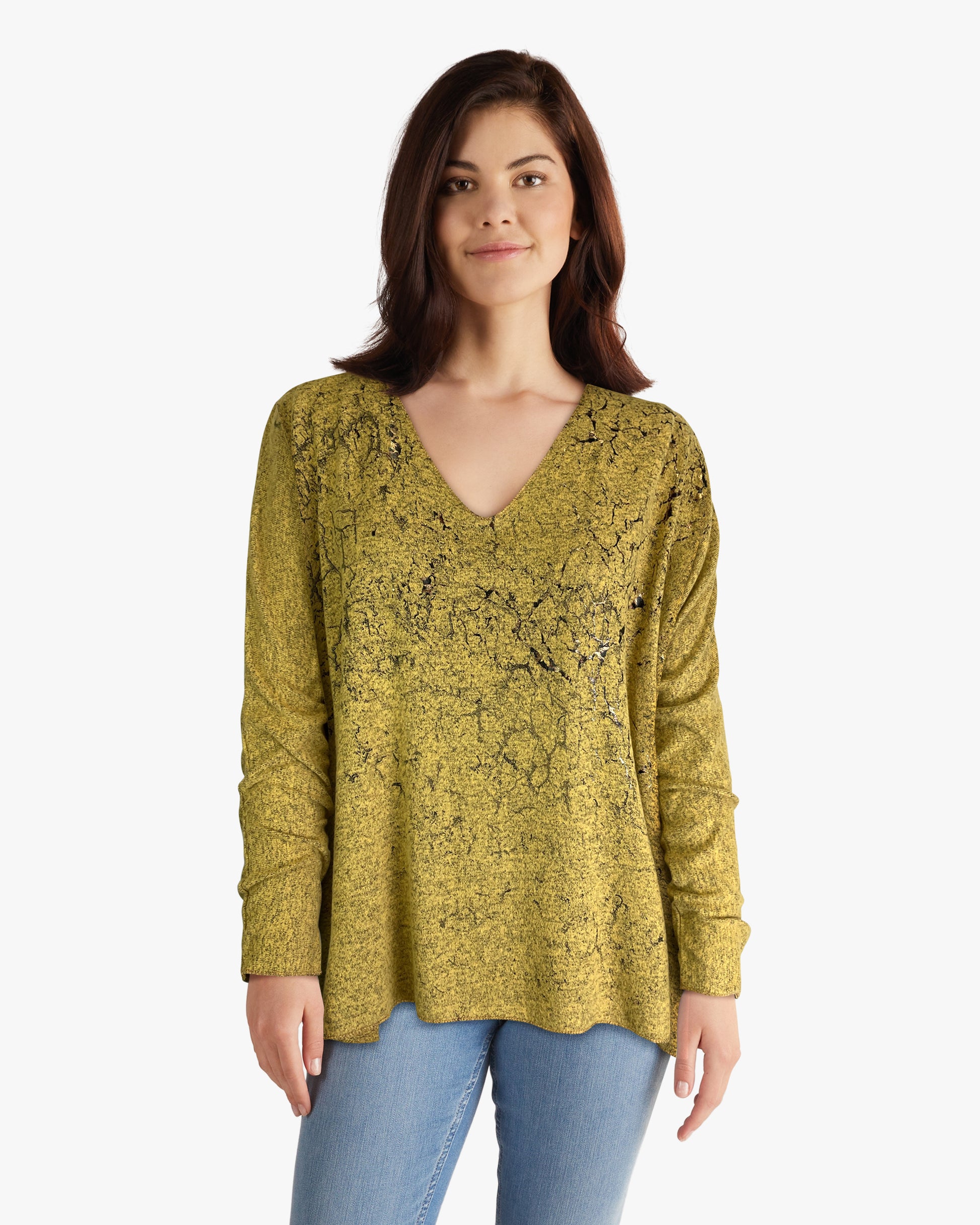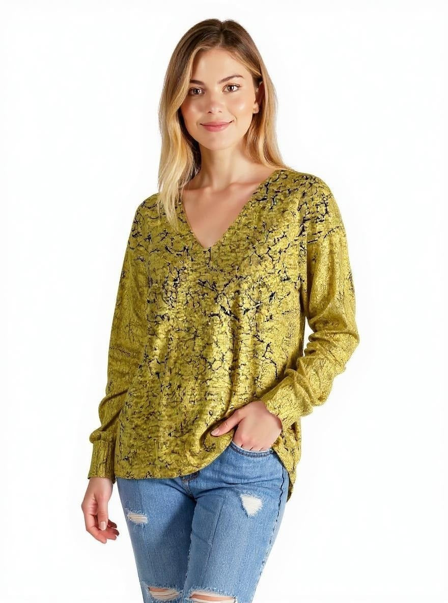 Sweater-like V Neck Foil Screen Top - Messing (D1993FS)