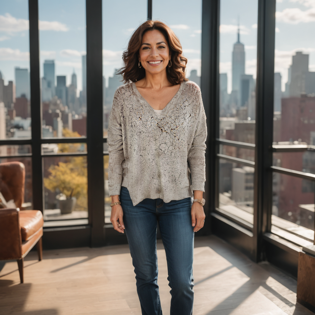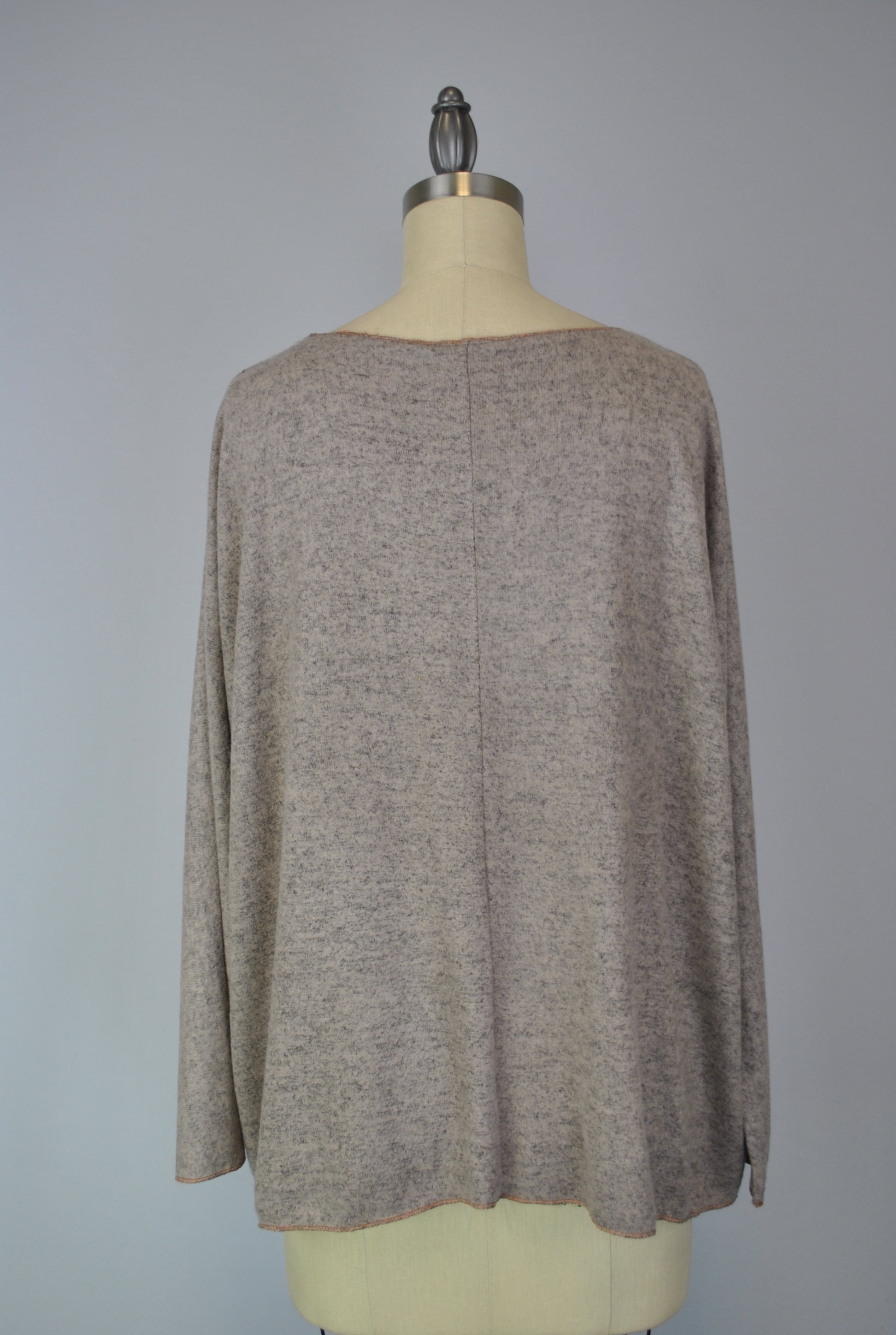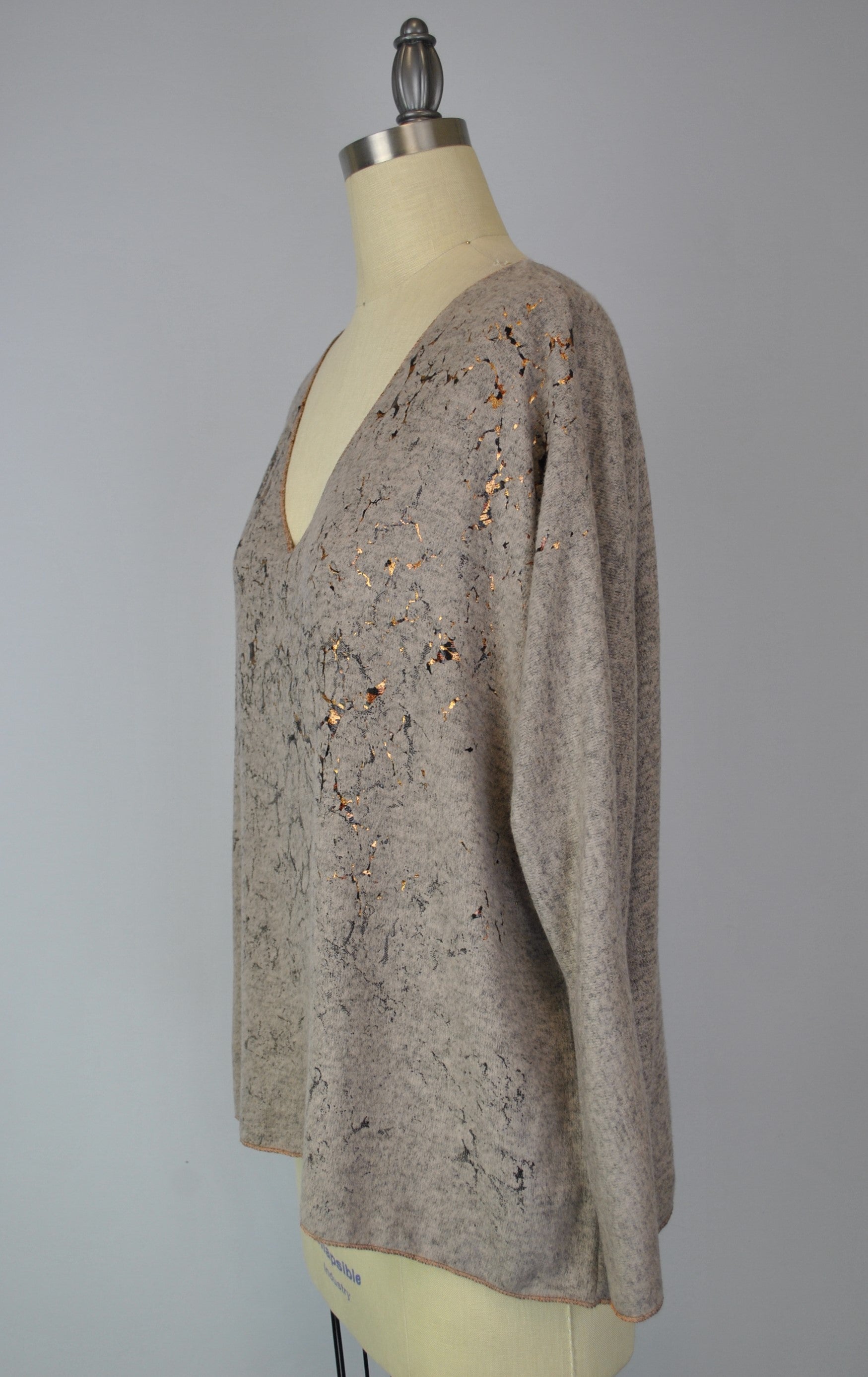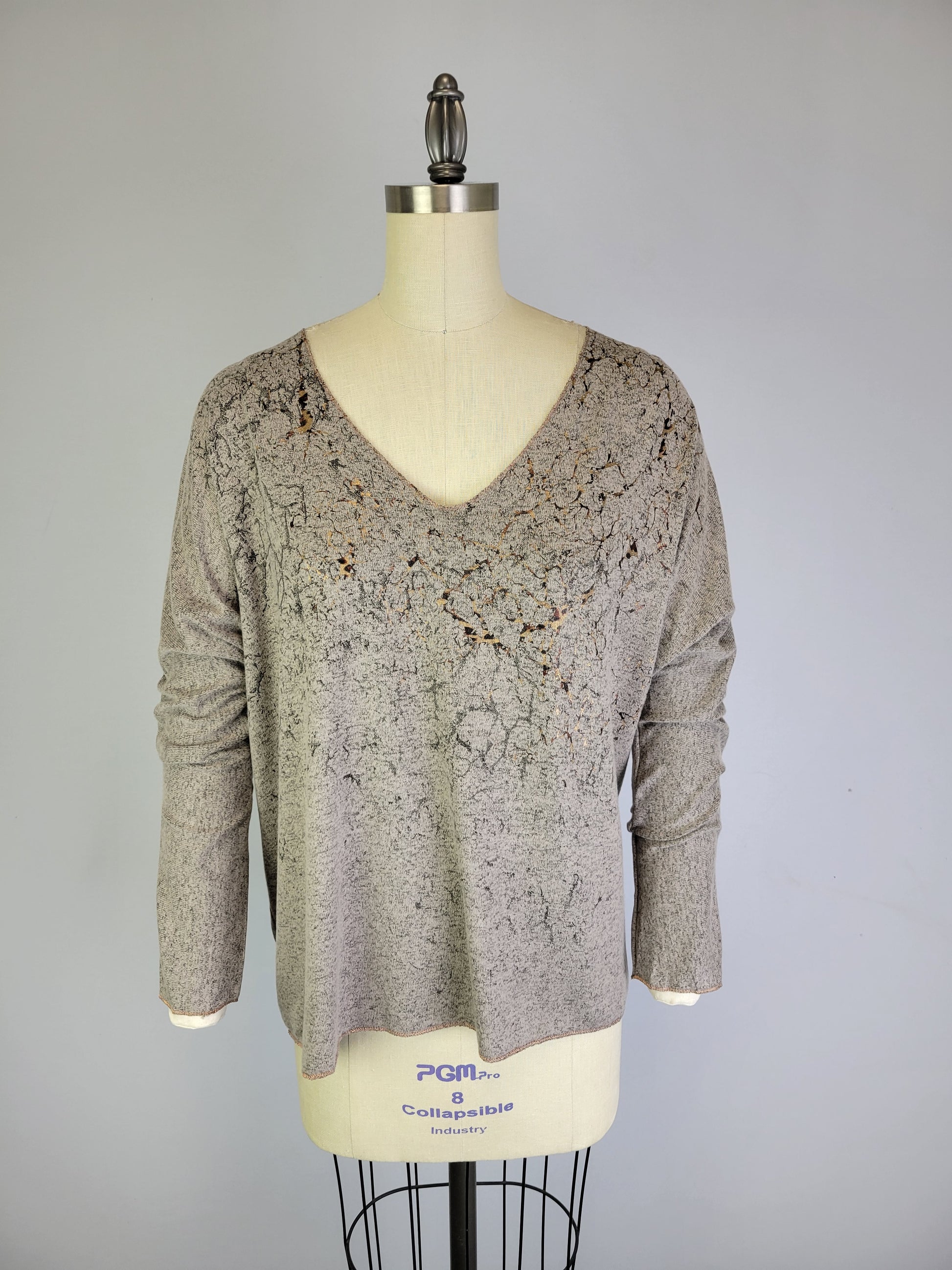 This top is made from a unique fabric we call Yummy, that is brushed for a super soft hand feel. It is a printed garment. Fit is more boxy in shape. There is a copper foil design on the front of garment. It has a V-neck, and has special stitching detail at the sleeve opening and bottom opening.