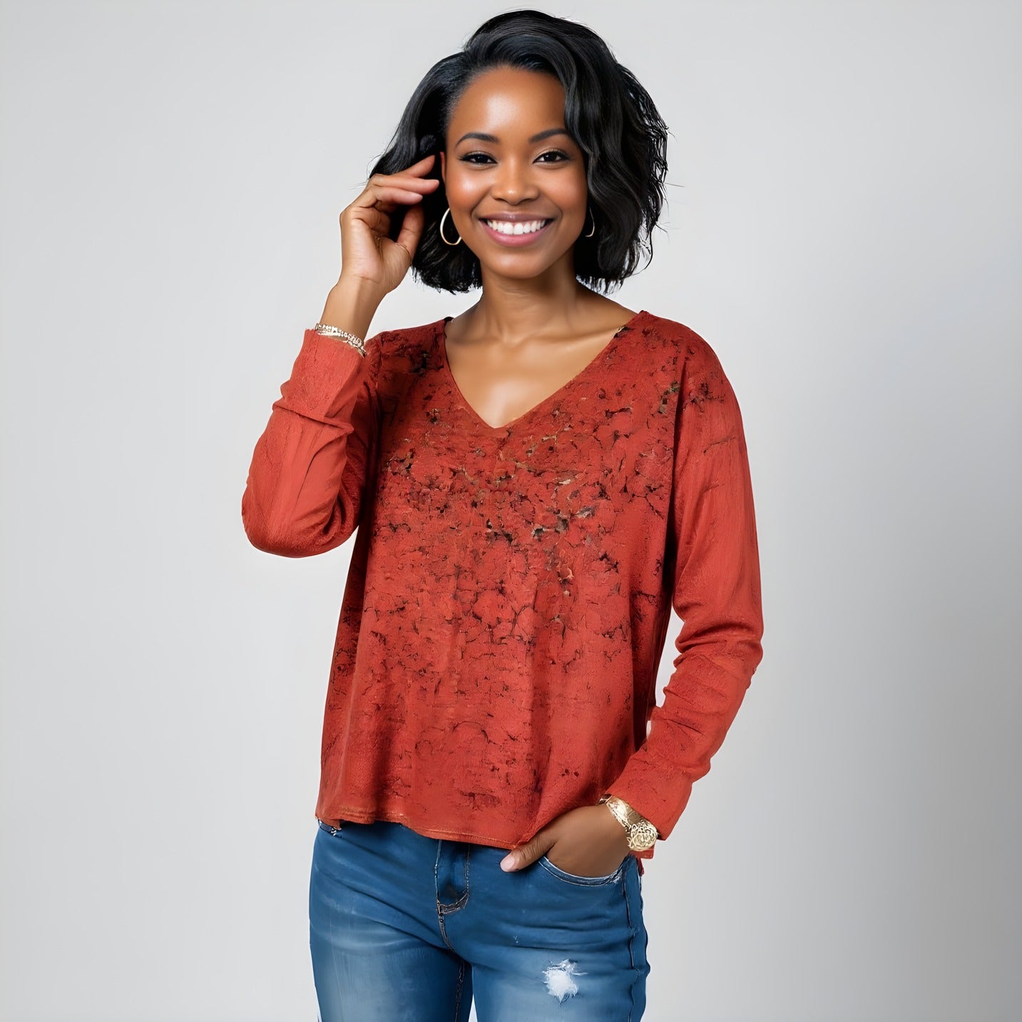 This top is made from a unique fabric we call Yummy, that is brushed for a super soft hand feel. It is a printed garment. Fit is more boxy in shape. There is a copper foil design on the front of garment. It has a V-neck, and has special stitching detail at the sleeve opening and bottom opening.