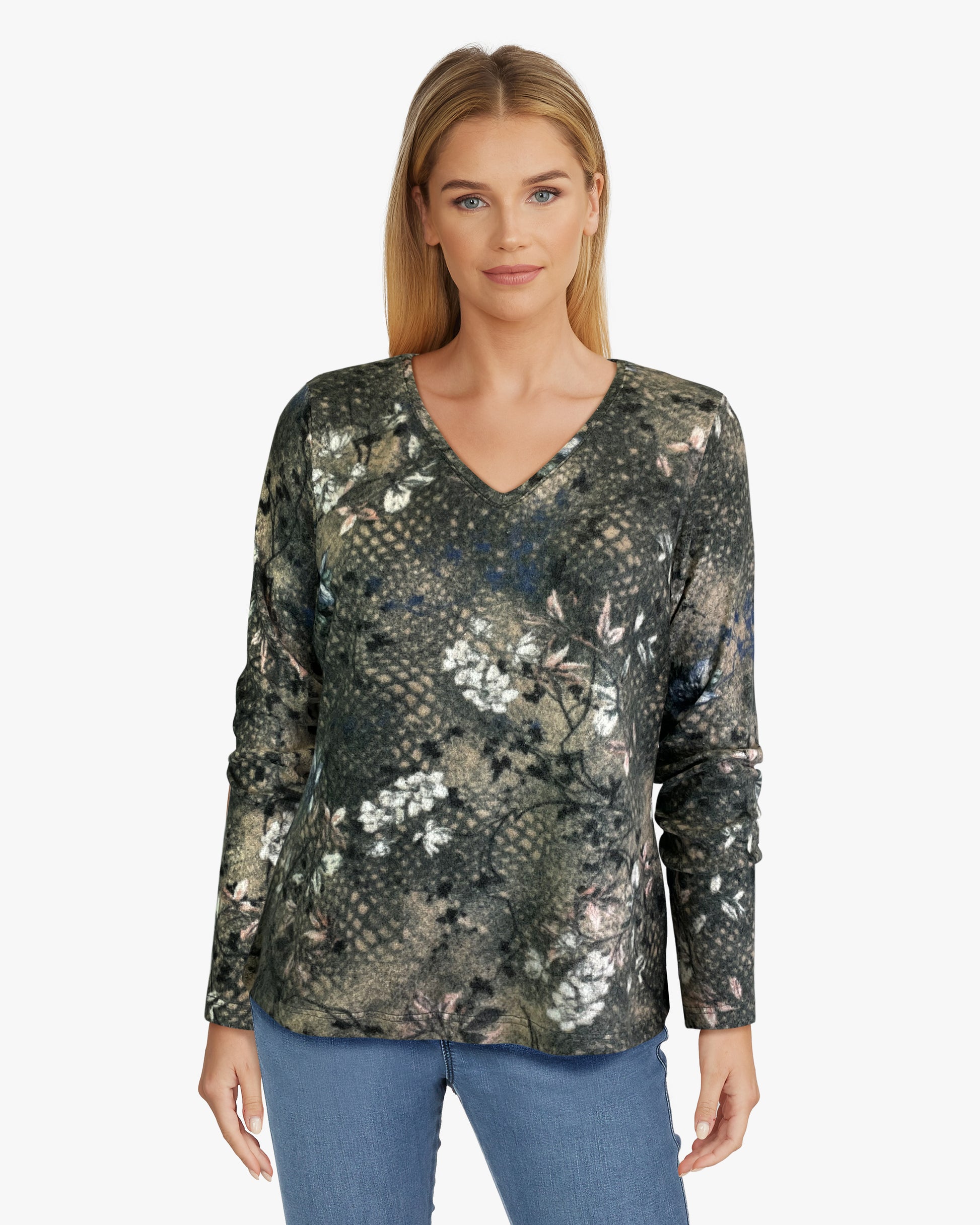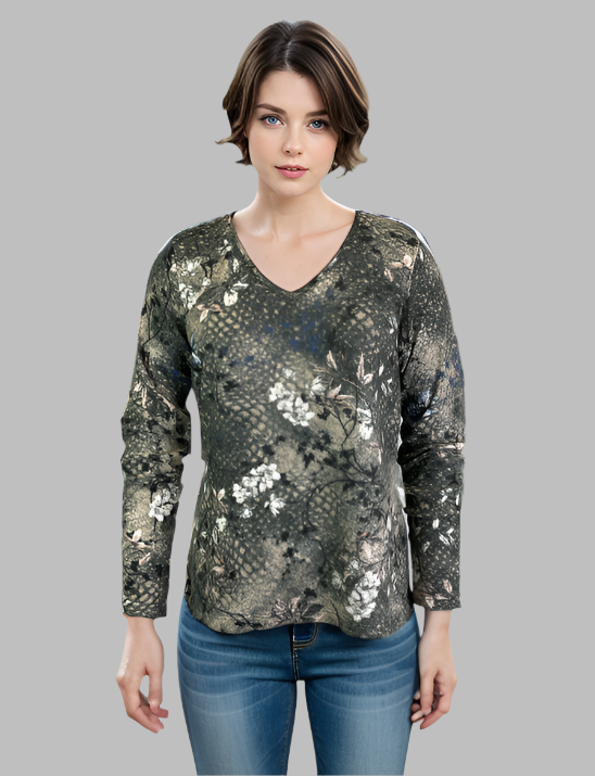 Sweater-like V Neck Print Top - Flower (D24556Y)