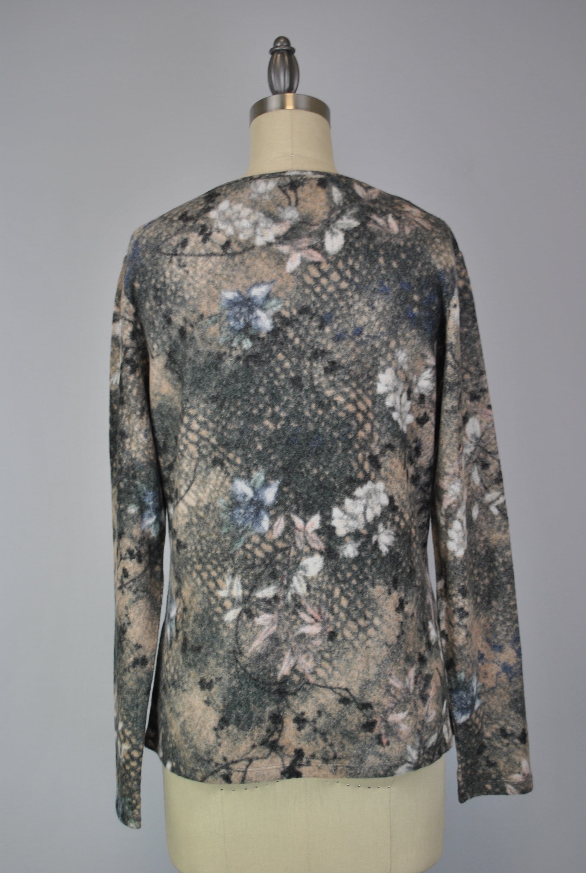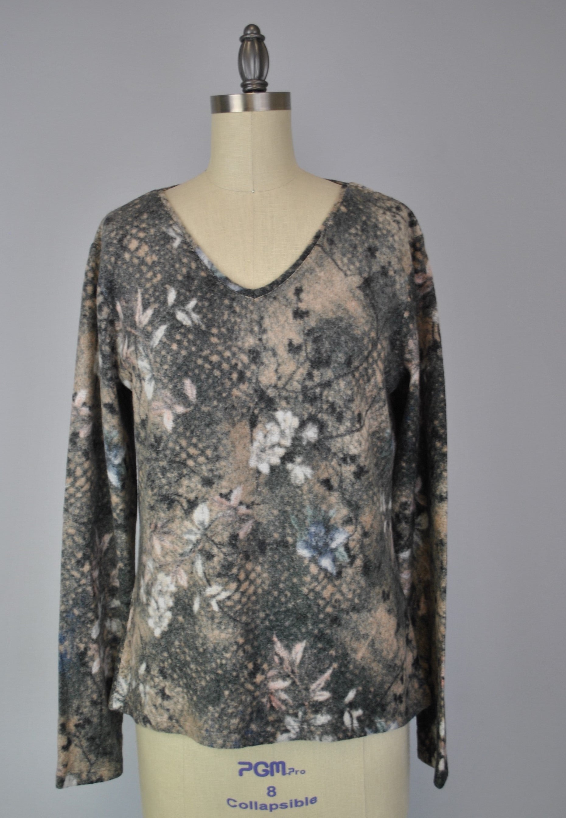 This top is made from a unique fabric we call Yummy, that is brushed for a super soft hand feel. It is a printed garment. Fit is more boxy in shape. It has a V-neck, and is hemmed at the sleeve opening and bottom opening.