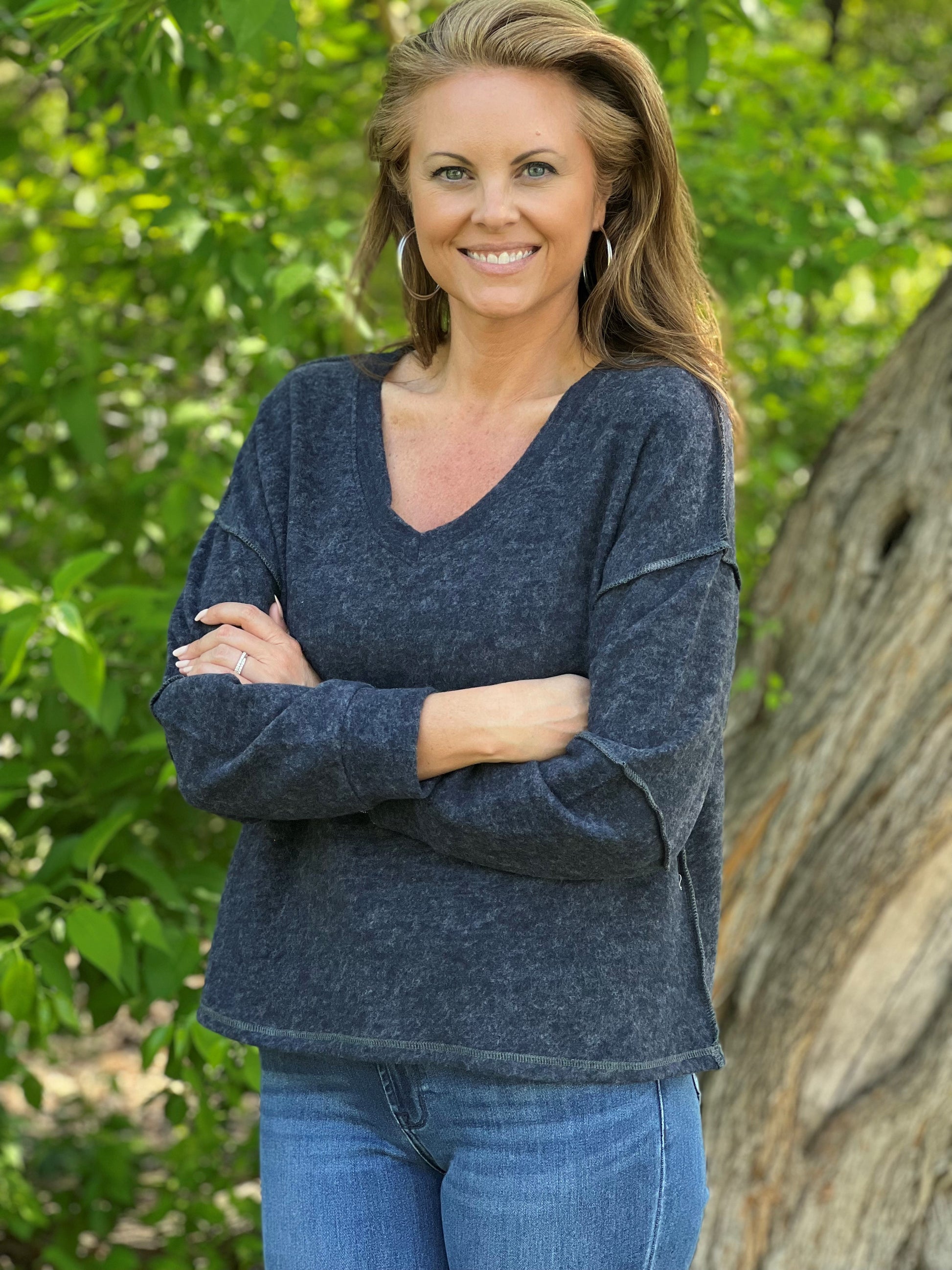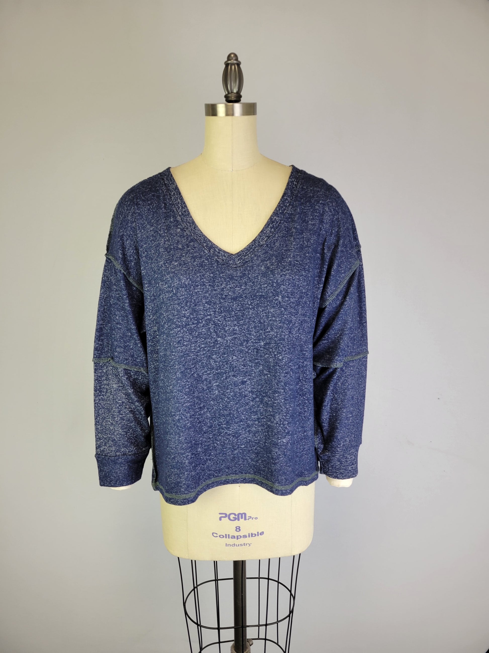 This top is made from a unique fabric we call Yummy, that is brushed for a super soft hand feel. It has exposed seams at the shoulder and hem with contrast stitching. Fit is very boxy, off the shoulder in shape. It has a V-neck Sleeve opening is cuffed.